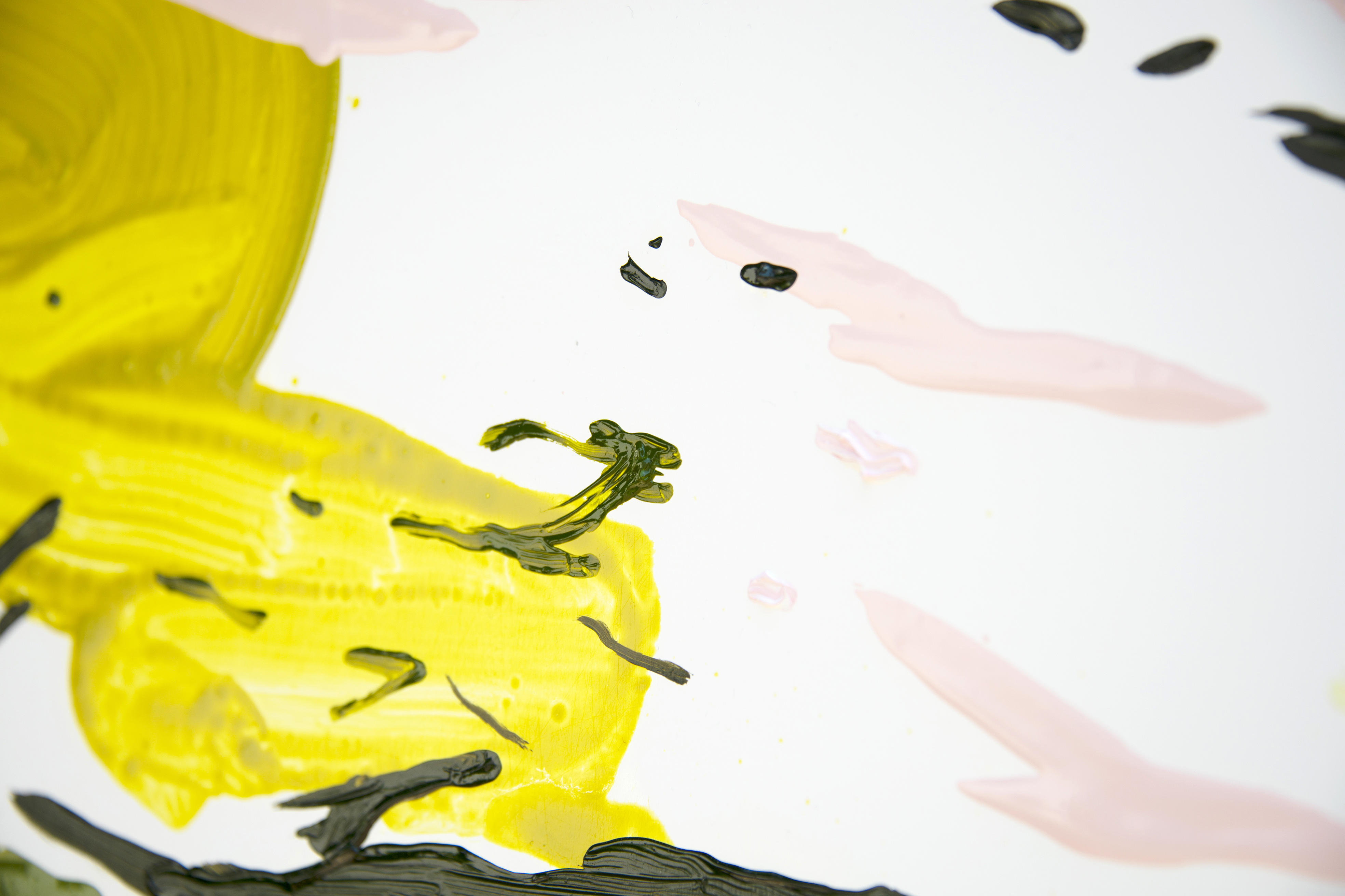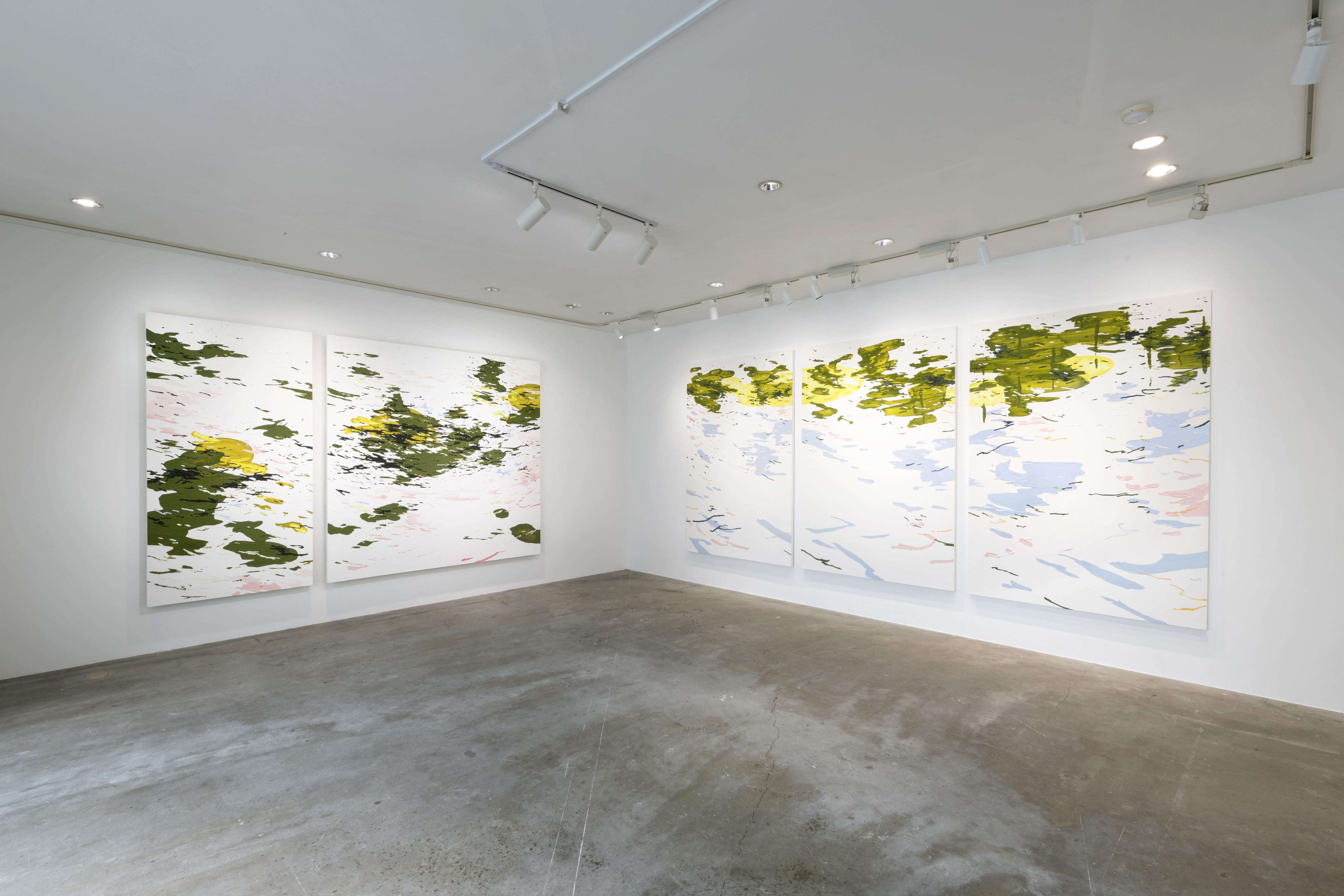 また、今回は新しい試みとして、これまでも描いてきた水面に映り込んでいる樹々の緑や空の色のさざ波とは異なる黄色い有機的な丸っこい形も水面のなかに描いています。異質なものを入れることで見え方に不思議な感じが出ないかなと考えています。単に透明色の強い筆触で描き、私の動かしている筆圧みたいなものを感じられるような感覚を込めました。