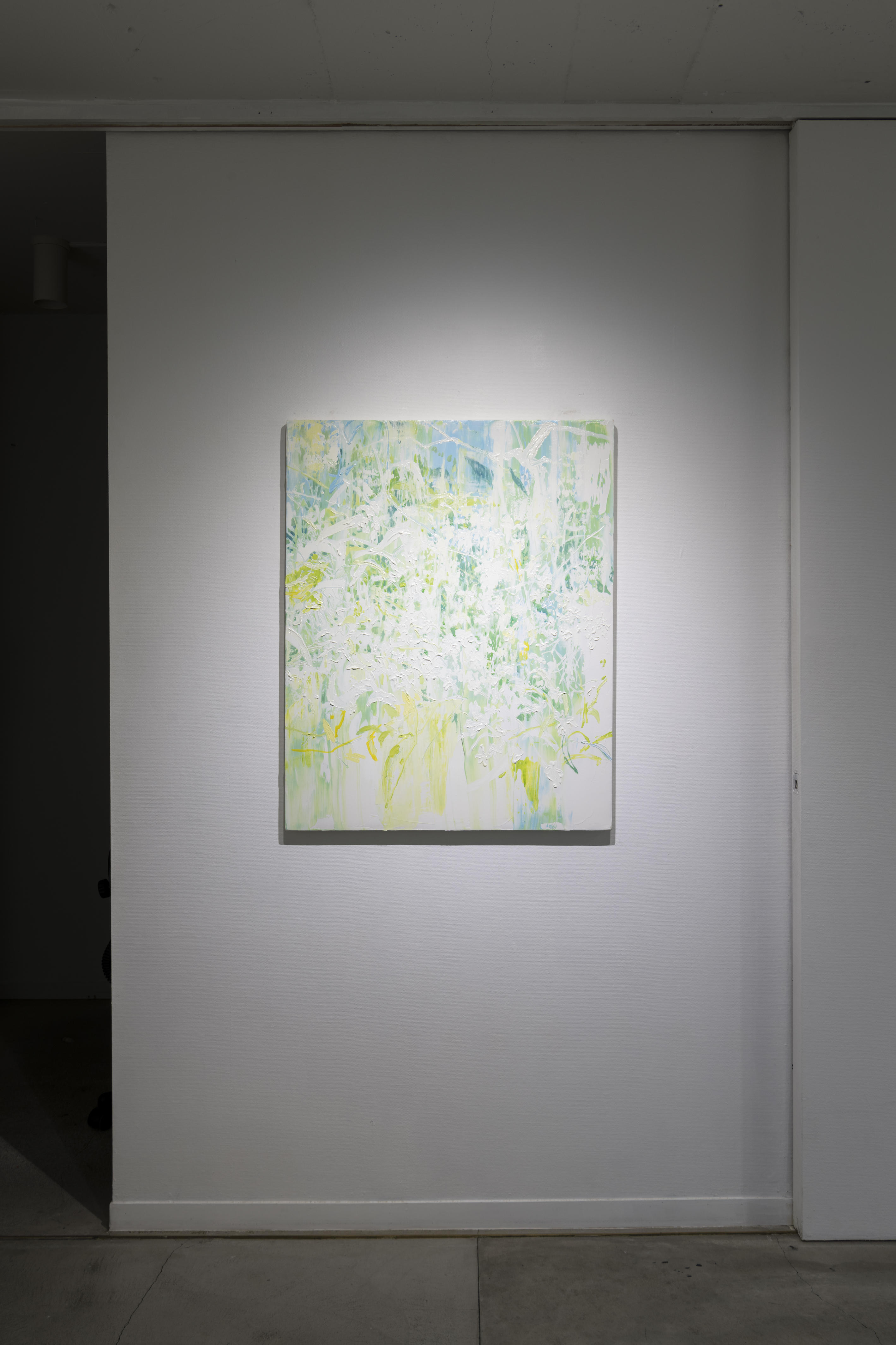 今回の作品は、いつもの光を感じてそれを画面に定着させるという手法に加えて、絵画の平面性を足しています。透明色の太いストロークを垂れさせたり、筆触を出していくようなことで、絵画の平面性をより感じさせるようなことをできないかと思ってやっています。
