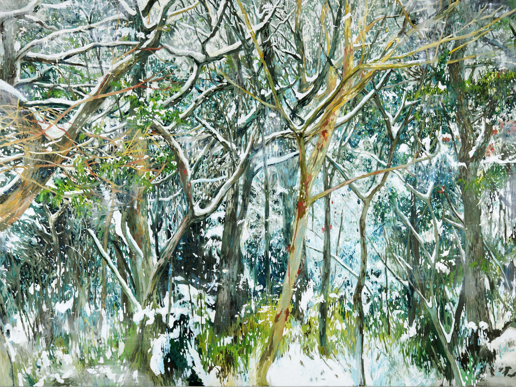 これまでにも作家は雪で充満して、飽和状態になっている空気を描いたことがあります。初めて家族と一緒に青森の雪を体験したときの作品です。この作品は作家が2回目のVOCA展に選出されたときのもので、樹木の枝がまるで身体を流れる毛細血管のような勢いで描かれています。描きこまれたディテールの折り重なりには、スピード感をもって描かれるドローイングにはない強さが感じられます。