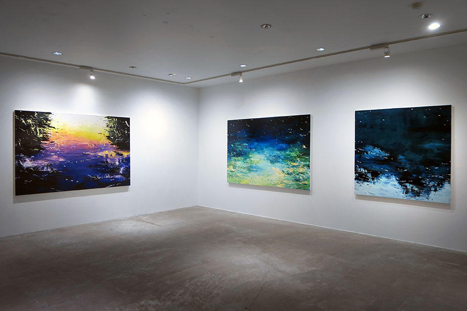 まるでサバンナの夕日を思わせる120号の作品は、今年の夏に描かれました。「今年は夏暑くて、空の色が濃くて彩度の高い日が多かったんです。水面の色も空の色を反射して、あまり今までにない色がみえてきました」と語る北城さん。空・雲・水といったつかみどころのないモチーフを描くとき、あくまでそれらをつつみこむ空気とそこに差し込む光を冷静にみつめ、油彩の場合には作品の空間を構成していくといいます。画面の中にいくつかのレイヤーが重なり、深度をかたちづくっていくのです。