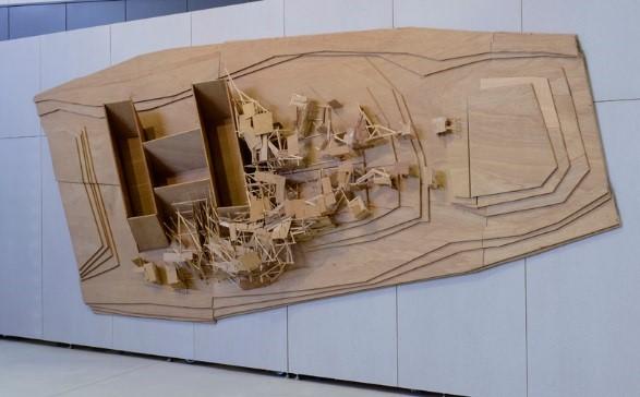 実際、6メートルの幅をもつルーズベルトのマケットは、大型のプランとして残る貴重な作品で、ニューヨーク街なかの工事現場からかき集めたという木材を惜しみなく投入して歴史的なサイトに果敢に乗り込んだ川俣の意気込みを表している。その後につながるファヴェーラ風の小屋も点在し、遠くから見れば一つの巨大な生き物のようにも見えてくる。木材を積み重ねて面を構成し、うねりを生み出す手法は今回の「工事中」再開のインスタレーションにも連なっているのかもしれない。
