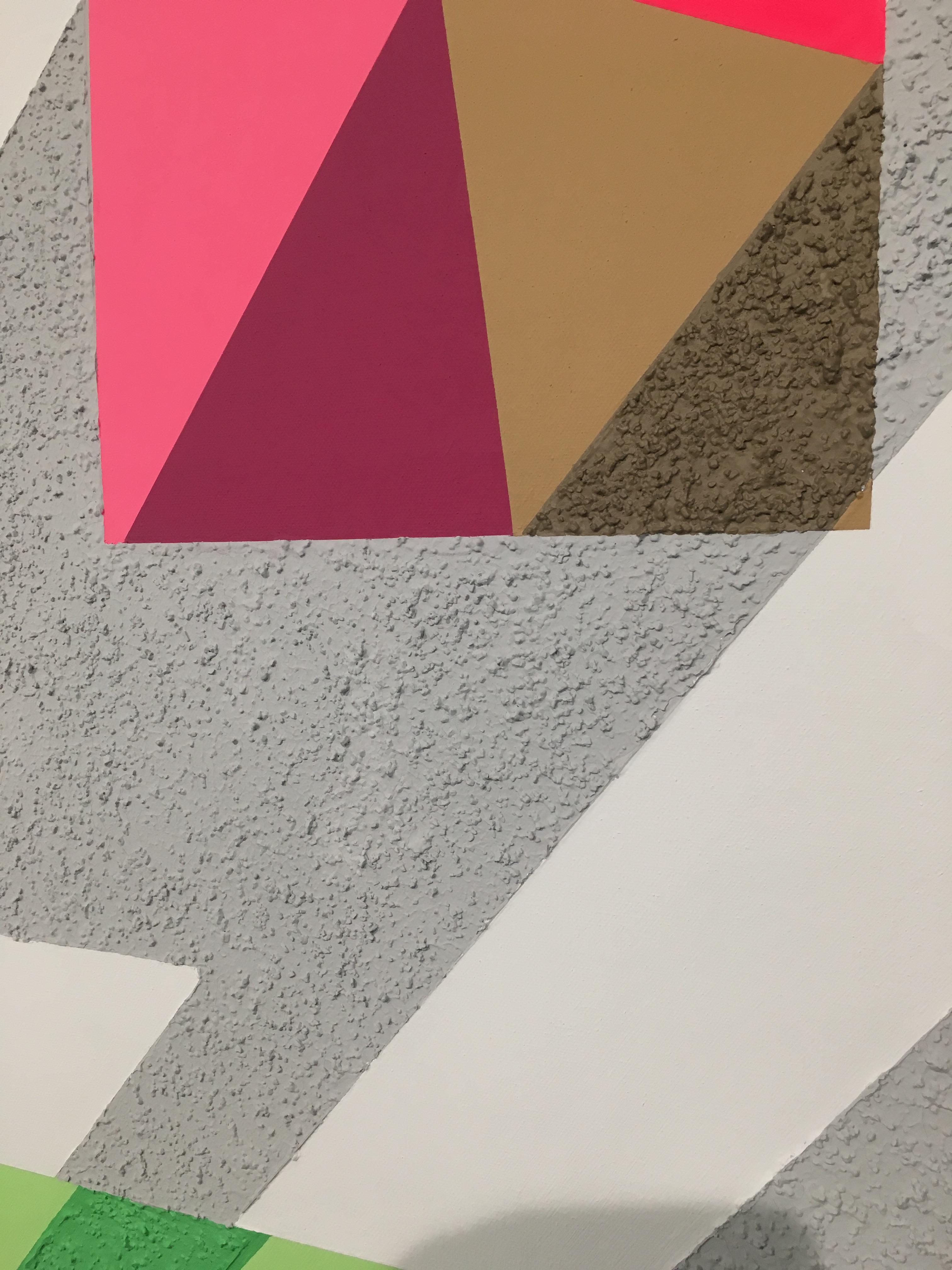 G: ということは、一見色面の抽象絵画のように見える絵の中に掛けられている絵画も原田さんの創った仮想空間をズームインした風景の一部だったんですね。こんなところで、ミクロとマクロの使い分けをしているとは驚きました。笑