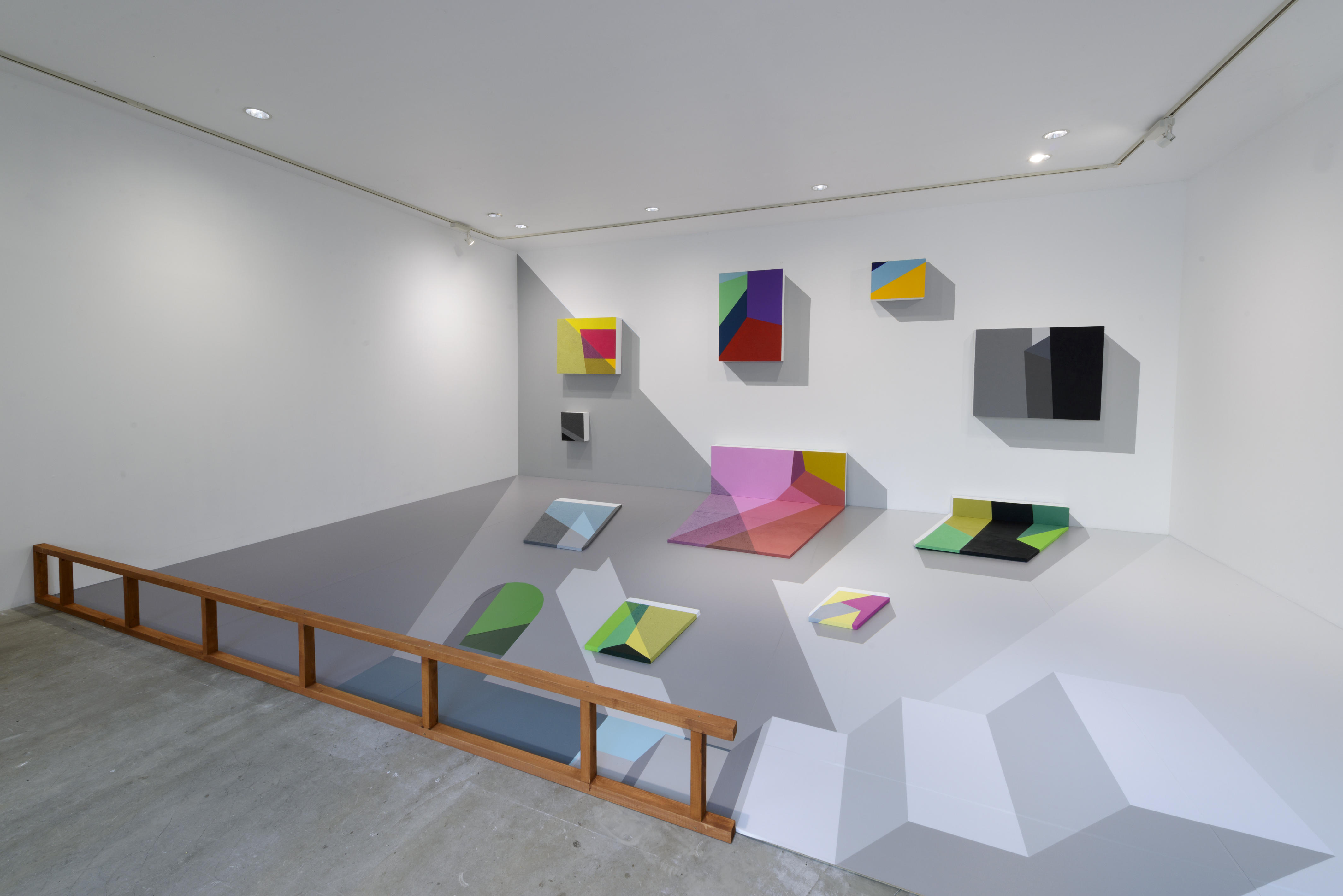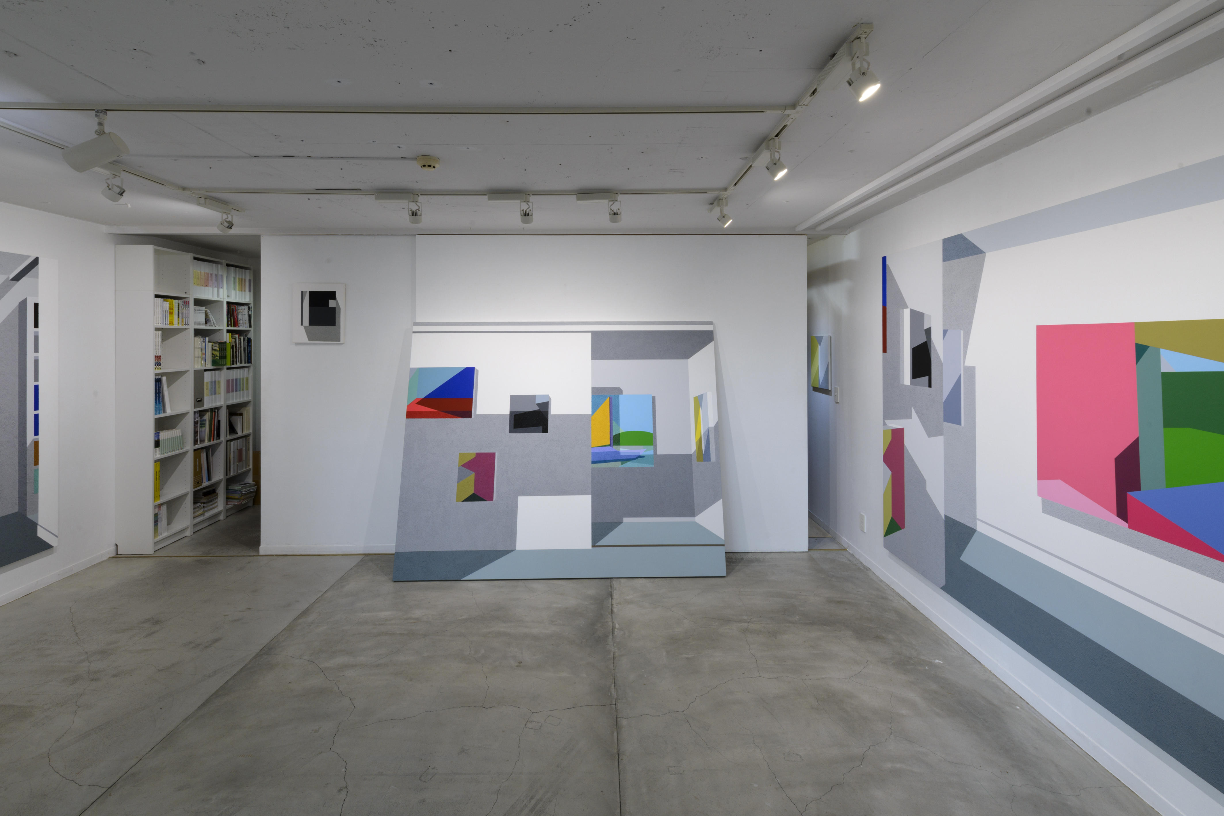 Gギャラリーでは図面を元に構成された仮想の2次元世界を絵におこし3次元へ、それを実際の空間に配置する。現実に落とす影や気配なども積極的に取り込み、多次元が同居した遊びある空間になったと思います。