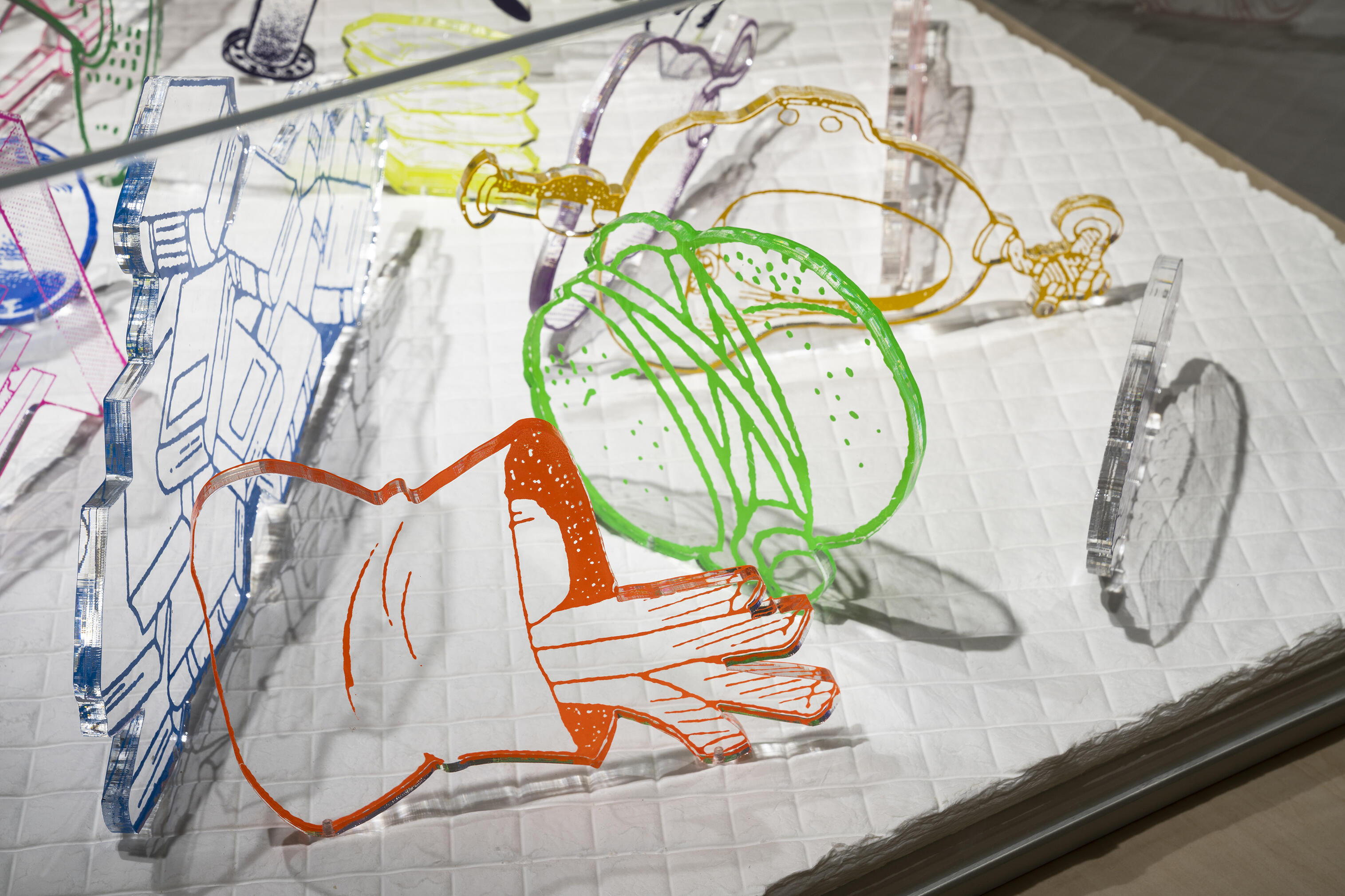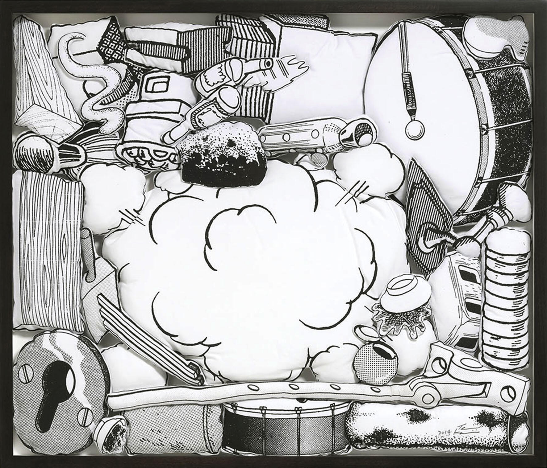 「漫画のイメージ=形のないもの」に物質感を与えて、そこから作品を創作しています。そのことによって素材も、クッションやアクリル板、ベニヤ板、プリントなど様々なものが使用されます。