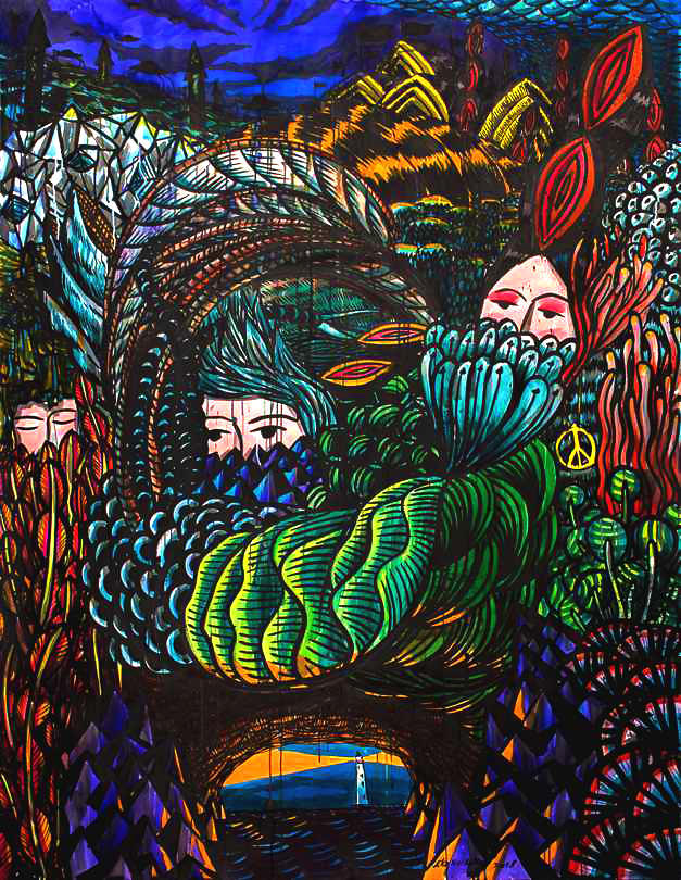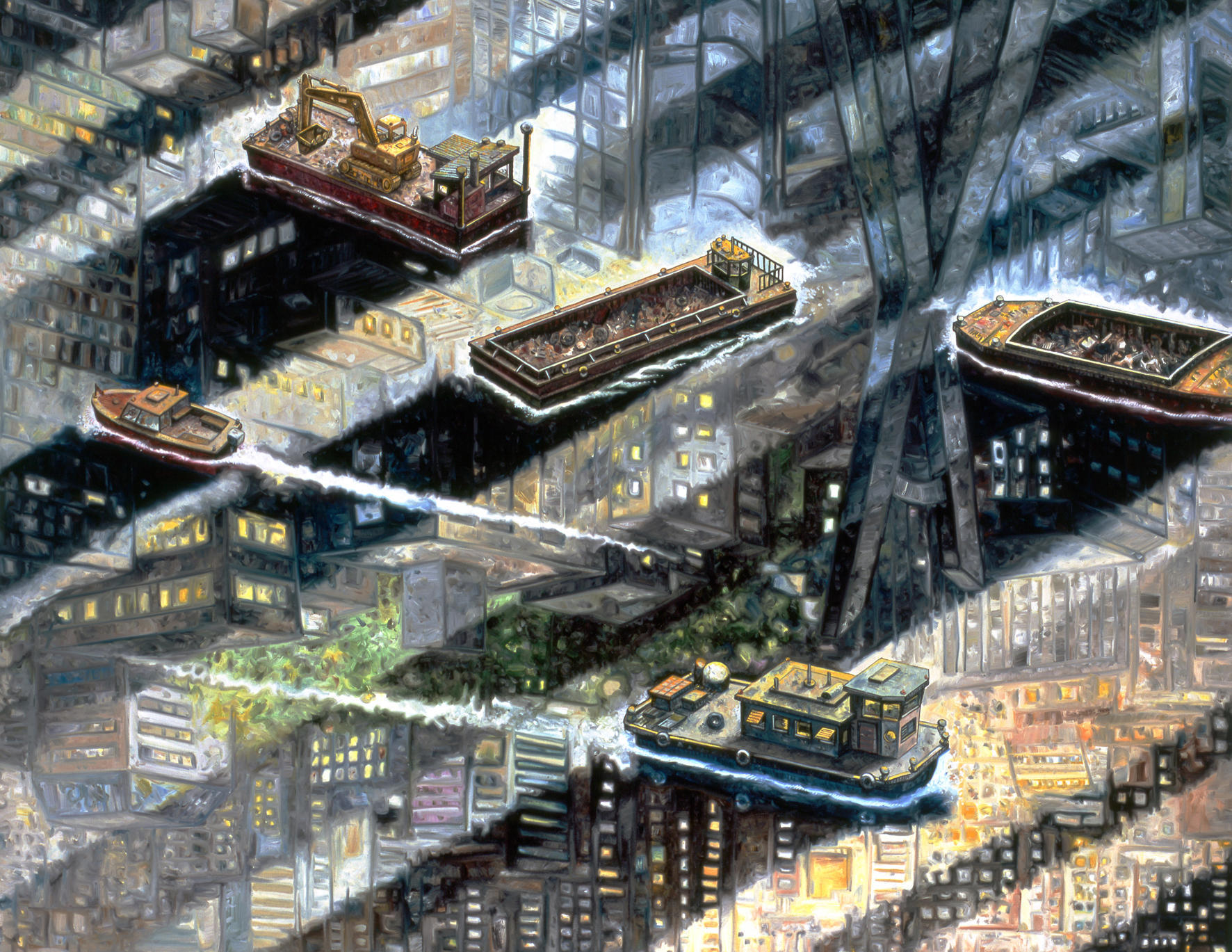 サンパウロで生れ、日本やニューヨークでアーティストの仕事を展開してきた大岩オスカールはまさに「旅人生」を送っている。そんなオスカールが、海は繋がっている、どこにいても同じ海を見ているという思いをこめて川の情景を描いた。これはサンパウロを流れる、市民から愛着のあるピニェイロス川を描いたもので《Pine River》と名づけられた作品。悠々と流れる幅の広い大河(以前は蛇行していた形状を20年以上の河岸工事でまっすぐにした)に、重機などを載せた大型の船が往来し、水面に映る街の夜景と穏やかに交じりあう。(詳しい作家情報)