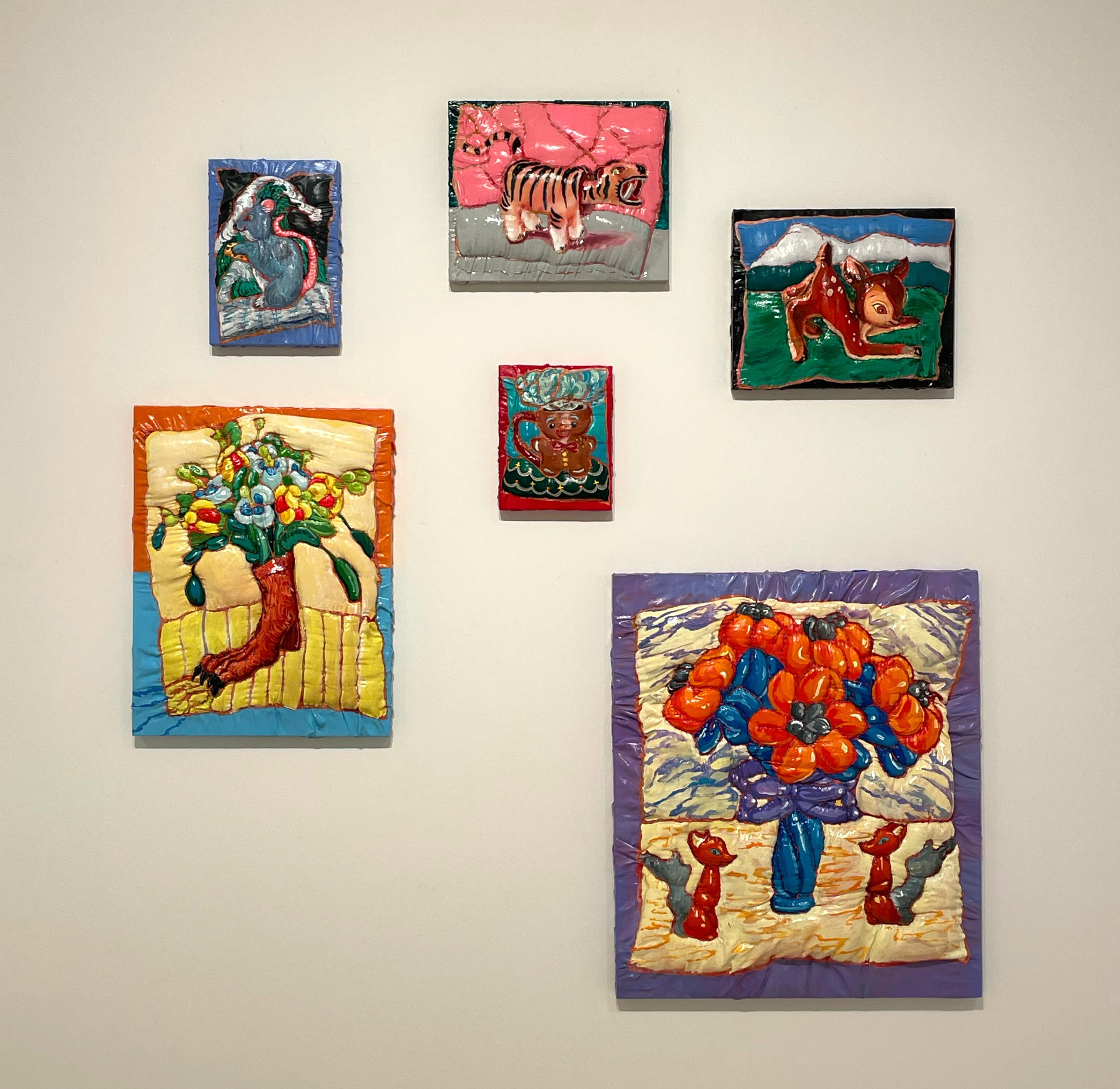 今回の作品では、日常生活の断片をを刺繍とペインティングを組み合わせた作品でのアプローチを試みました。(作家コメントより)