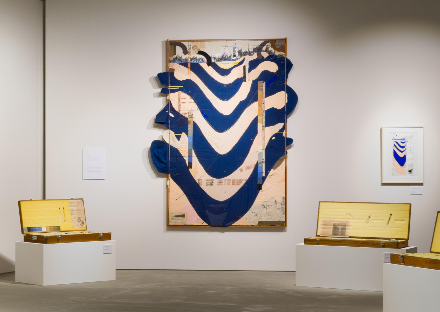 写真中央:《房総の帯水層・地下水》布コラージュ、253x188cm、1995(「磯辺行久―環境・イメージ・表現」展(市原湖畔美術館、2013)展示風景)