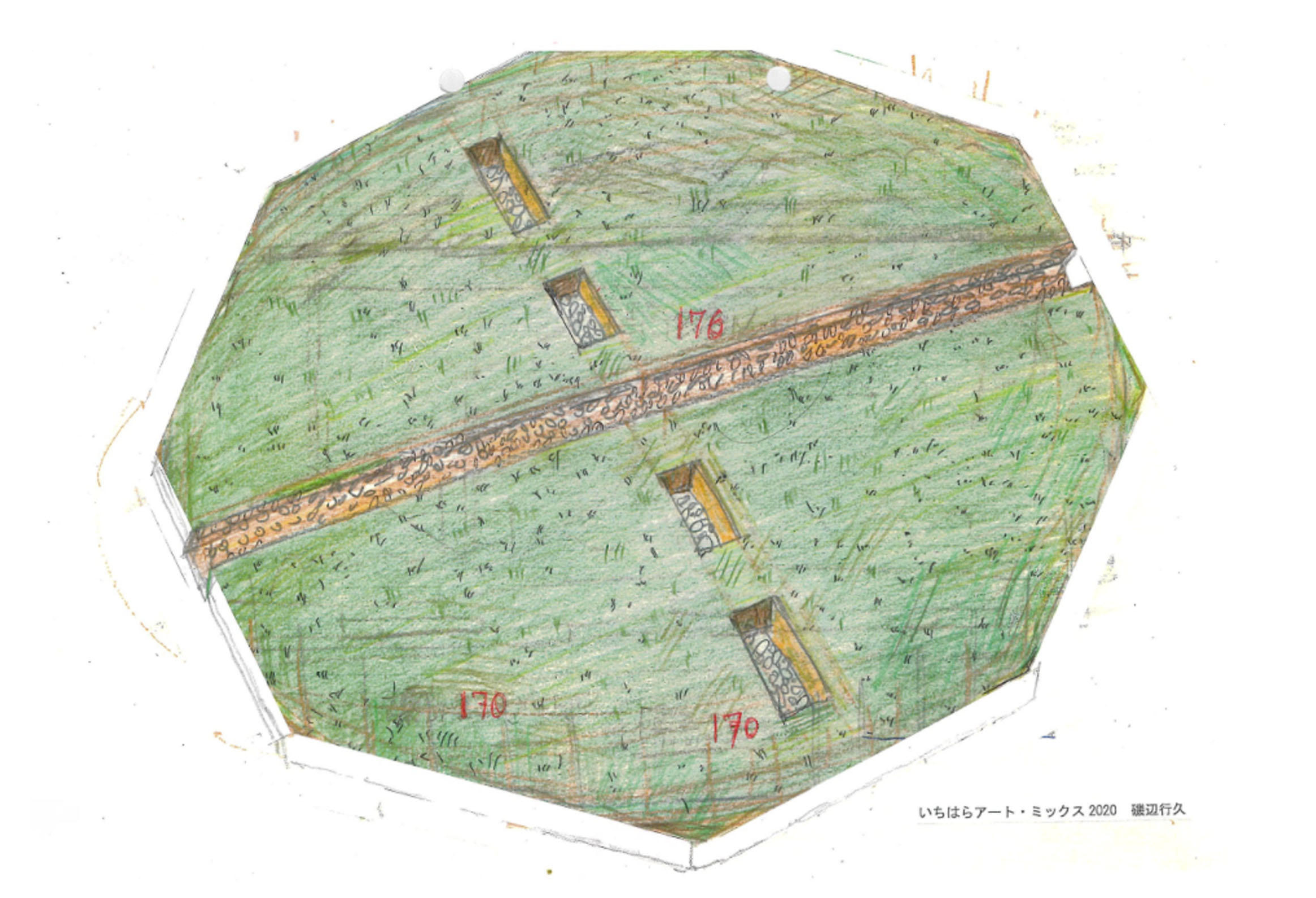 今回のいちはらアート×ミックス2020+で磯辺は、チバニアンの地層を見ることができる市原の田淵の里を舞台にしたプロジェクト《6000年前、養老川の本流がここを流れていた》《養老川を翔ぶ》を発表しました。チバニアンは77万年に起きた最後の地磁気逆転現象を連続的に捉えることができる地層であり、かつての養老川の本流を示しています。磯辺は《6000年前、養老川の本流がここを流れていた》において、今から6,000年ほど前の、養老川の本流であった地形の一部を再出現させました。また、オープン初日限りのプロジェクト《養老川を翔ぶ》では、熱気球を飛ばし作品全域を上空から俯瞰して鑑賞するイベントが行われました。