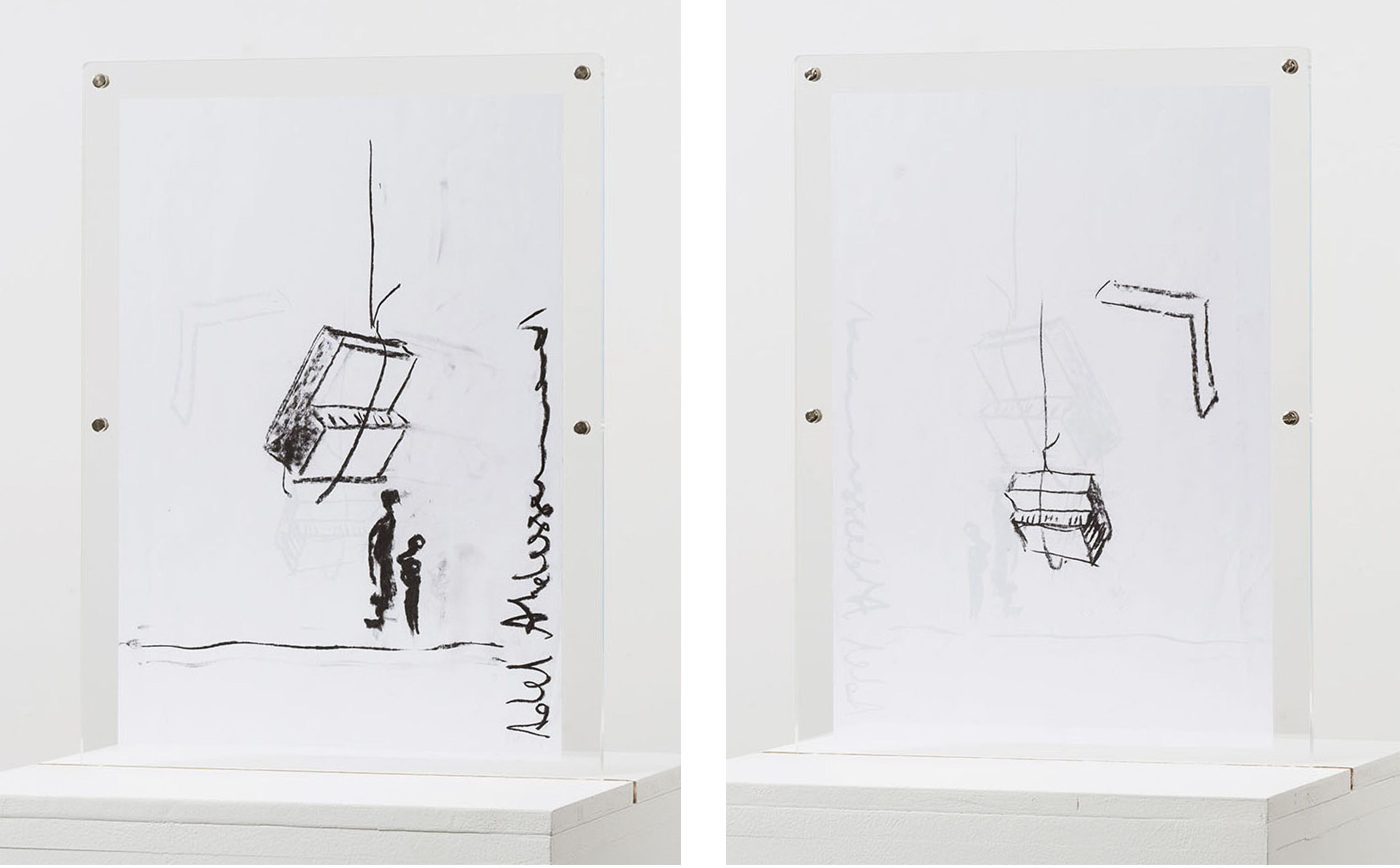 そして、ここでは2020年のアートフロントの個展でも発表されたドローイング作品を紹介します。A3サイズの紙に木炭で描かれた本作は、いちはらアート×ミックス2020の為に制作されました。表面には吊り下げられたピアノを見上げる人物のシルエット、そして背面には反対側から見たアップライトピアノが描かれています。アデルはどのプロジェクトにも多くのドローイングを残しており、それらは作家が思いを巡らせた思考の軌跡であると同時に、それ自身が作品となっています。事実、近年出版されたアデルの作品集にはドローイングだけを集めた巻があり、ページを追うことによって、国内外で展開した立体作品やインスタレーションを想起することができます。