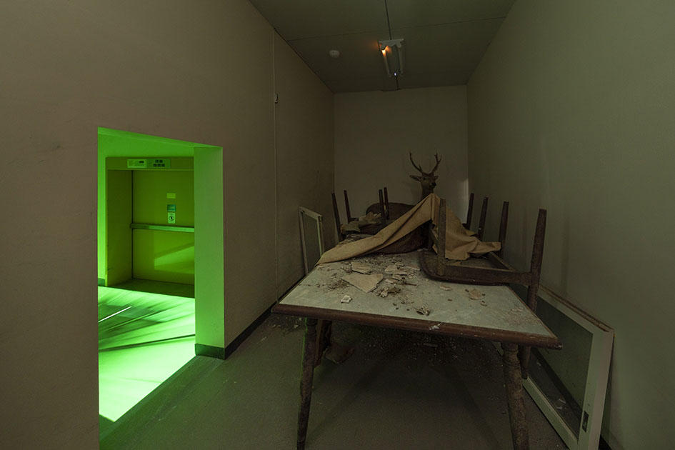 2つ目は1Fの職員用玄関の裏手に入り口がある給食配膳室とそのエレベーター を1Fから3Fまでを使った縦方向の空間を利用した作品です。 他の作品とは入り口が別になっており見逃さない様に注意したい作品です。 この作品は1つ目のヤコブの梯子の対となる作品で「下降」がテーマとなっています。 《The TOWER (Descension To The Emerald City) / 塔(エメラルド・シティに落ちる)》と名付けられたこの作品は冨安が幼少期に見たエメラルド色の塔の中をひたすらに落下する夢とタロットカードの「塔」の絵柄がそのモチーフになっています。エメラルドシティはアメリカ文学のオズの魔法使いに登場する架空の街です。1Fから3Fに向かうにしたがって各部屋に入った際の違和感は大きくなります。