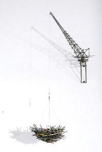 K:「人間の巣」や「黒い鳥」はさっき話に出たような建築素材との組み合わせになっています。ファンシーなものがとてもごつごつしたクレーンやコンクリートや鉄骨などによって作られて、表面だけが綺麗に覆われカモフラージュされているといった感じで、本当はこういうところに住んでいるんだと改めて驚きます。