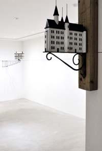 角:これはつばめの巣から着想を得ています。つばめの巣って街灯とか支柱の上とか結構色々ところにあるんですよね。人間も土地が狭いですし、強引に埋め立てたりとかして場所を作っているのを見て、どこか通じるような気がしたんです。そこからL字金具に対して建物が土地をそのまま伸ばしたような感じで立ったら面白いなと思って作りました。今回はデコラティブないかにも西洋の金具にお城をつけてみましたが、色々なL字金具に異なる建物をつけていくようなことは今後もやっていきたいと思っています。