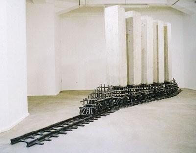 K:ここでも建築っていうのは出てきますよね。それまでは重機とか建築素材とかでしたが、今度は建物が出てきています。これは中国の置物であるような重い石のような形をしていますが、こういった重く見える物が軽やかで細い物で支えられているという点は共通しているように思います。例えば先ほどの地下鉄の作品では、重い柱を鉄道が運んでいるとか。このような重さと軽さの関係性はどういったところからきているのでしょうか?