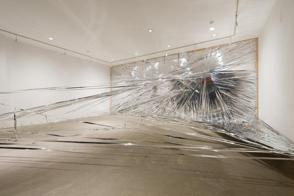 「はい。ボールペンの線が、絵具を触っていた指が、今回テープというさらに大きな単位で現れました。線を使って描画することではボールペンもテープも変わりはありませんが、テープは空間に張られるという部分で大きく異なります。画面の上を行き来していた線が空間に飛び出し、様々な角度で反射します。今回のインスタレーションで初めてチャレンジしました。この鏡面テープを使った空間への試みは、今後も展開させていく予定です。」