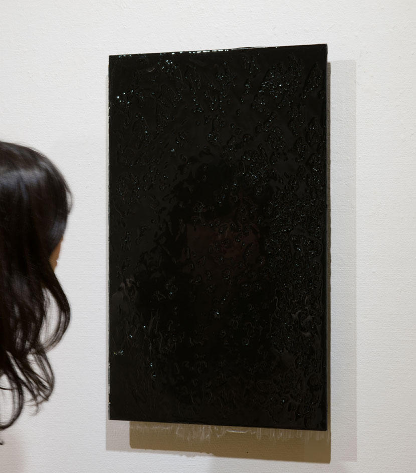 本展では黒いボールペンでぬりつぶすことによって見る側が作品に写りこみ、その表面にアクリルを貼ることによってより人や周りの風景が反射され、鏡のような効果を生み出しています。