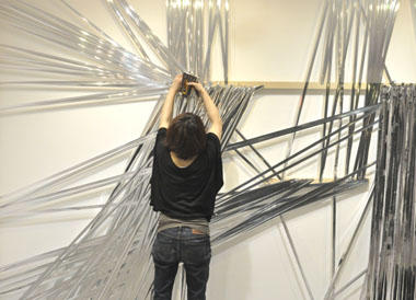 人の動き、視点によって光り方や映るものも変わり、テープは様々な表情を持つように思えます。壁と床を満たし、完成に近づいてゆきます。