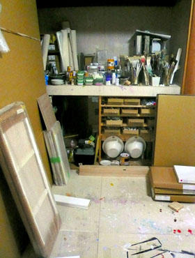 種類豊富な絵の具やパステルのほかにサイズや厚みの違う筆が見えます。すでに制作が終わり、展覧会を待つ作品が梱包され、立てかけてあります。
