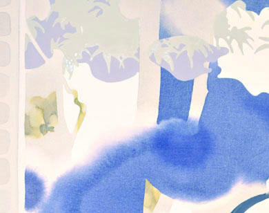 爽やかな色彩を扱うのみでなく、今回はモノトーンの作品も展開しています。今回は庭園など人工的に作られた風景を描いた展覧会です。具象と抽象が織り交ざった美しい作品から再構成された「庭」の風景をぜひお楽しみください。