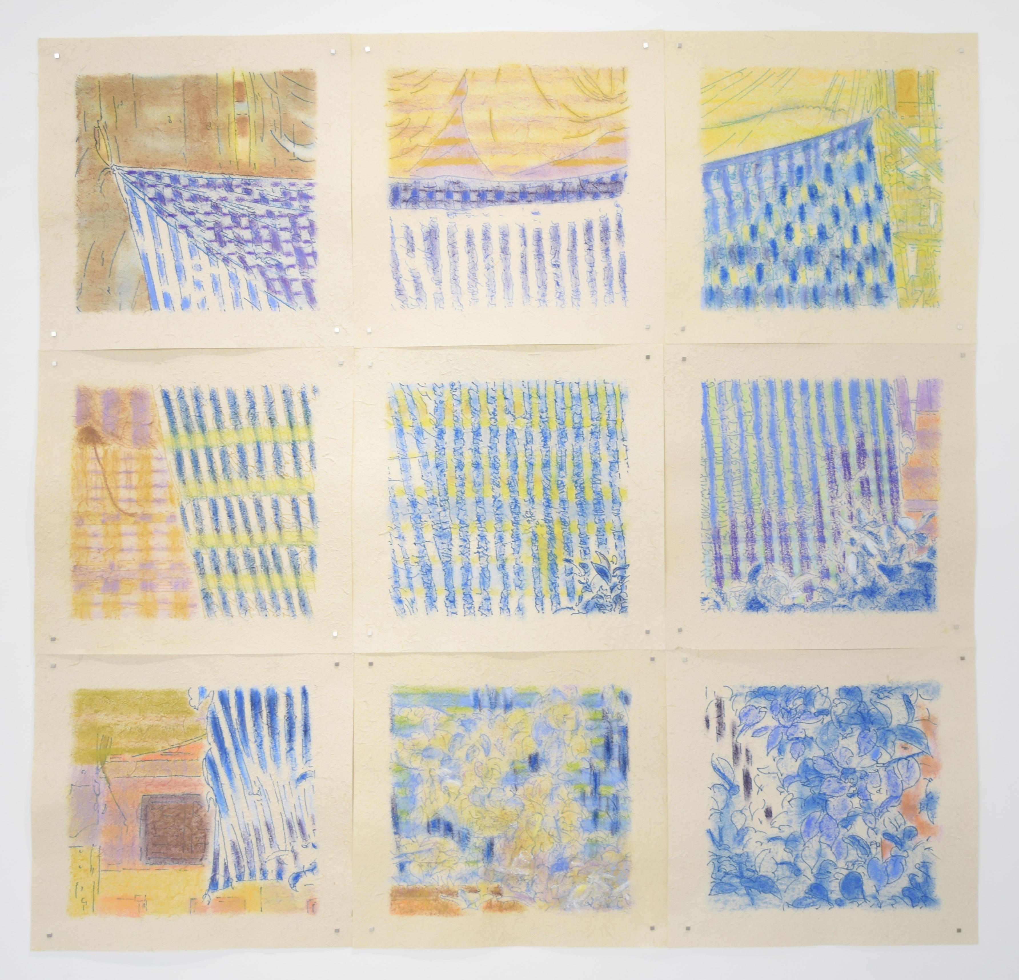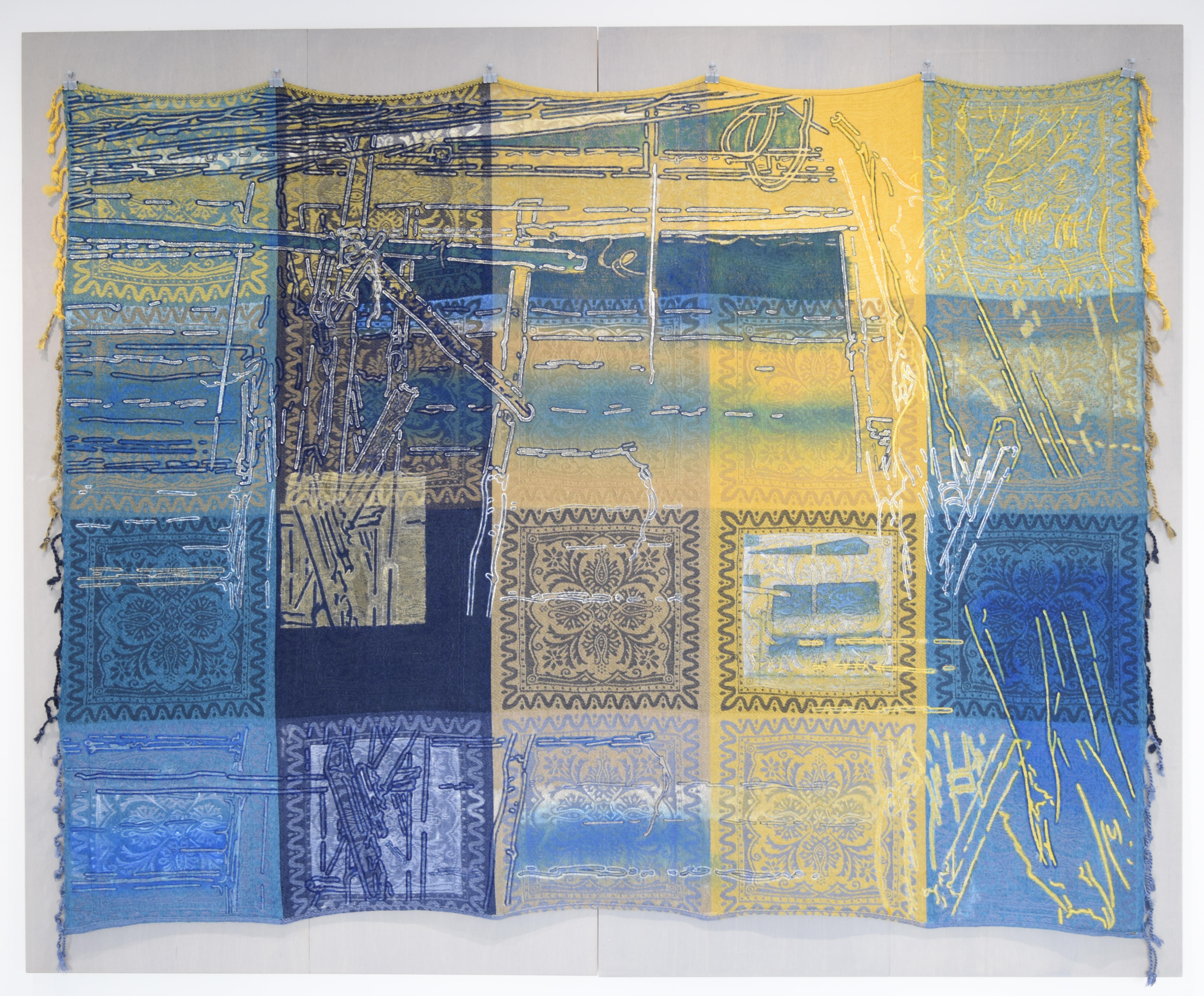 キャンバスの作品については、これまでの作品にように余白を見せるために構成しているという点で、共通しています。これと反対なのがこの織物の作品(Building Blocks – blue / yellow / intersection -)です。