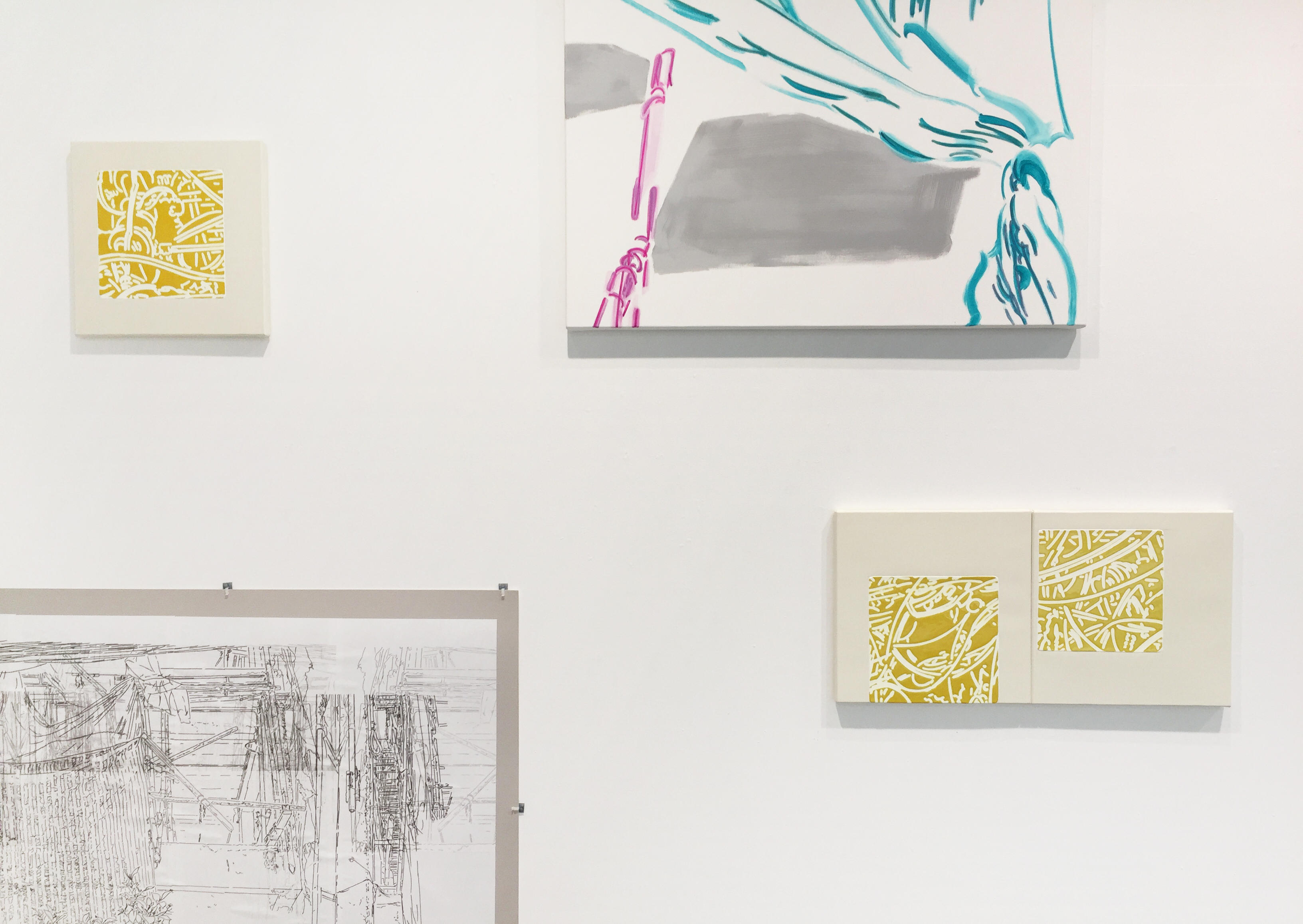 <中岡>5階建てぐらいのアパートの解体工事が共通のモチーフになっています。モチーフは同じでも、支持体によって全然違う作品になりうることを今回見せたいと思いました。画面がどう違うかを見せるために、余白の在り方、余白の表現方法を違うようにしてみました。