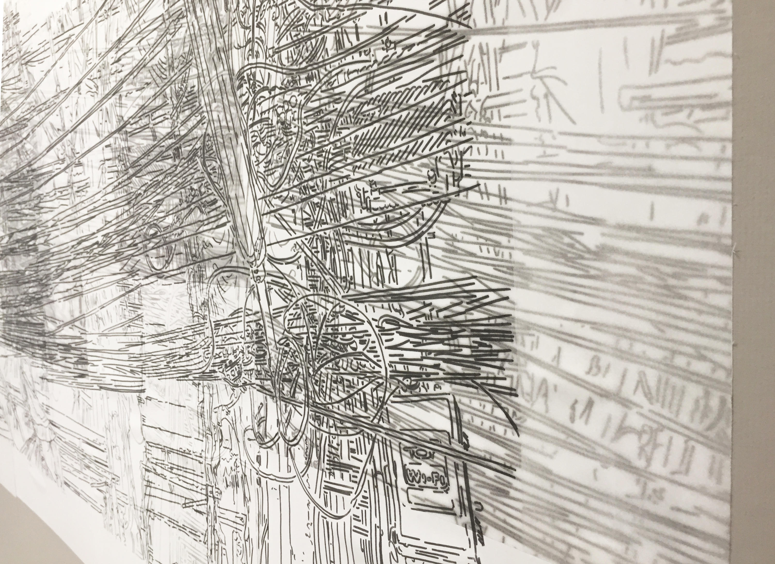 黒の向こう側がだんだんグレーになっていったり、場所によってはっきりしていたり曖昧だったりと、トレーシングペーパーを使うことによってこのような表現方法が可能になりました。線が面になっていくというプロセスを見せています。