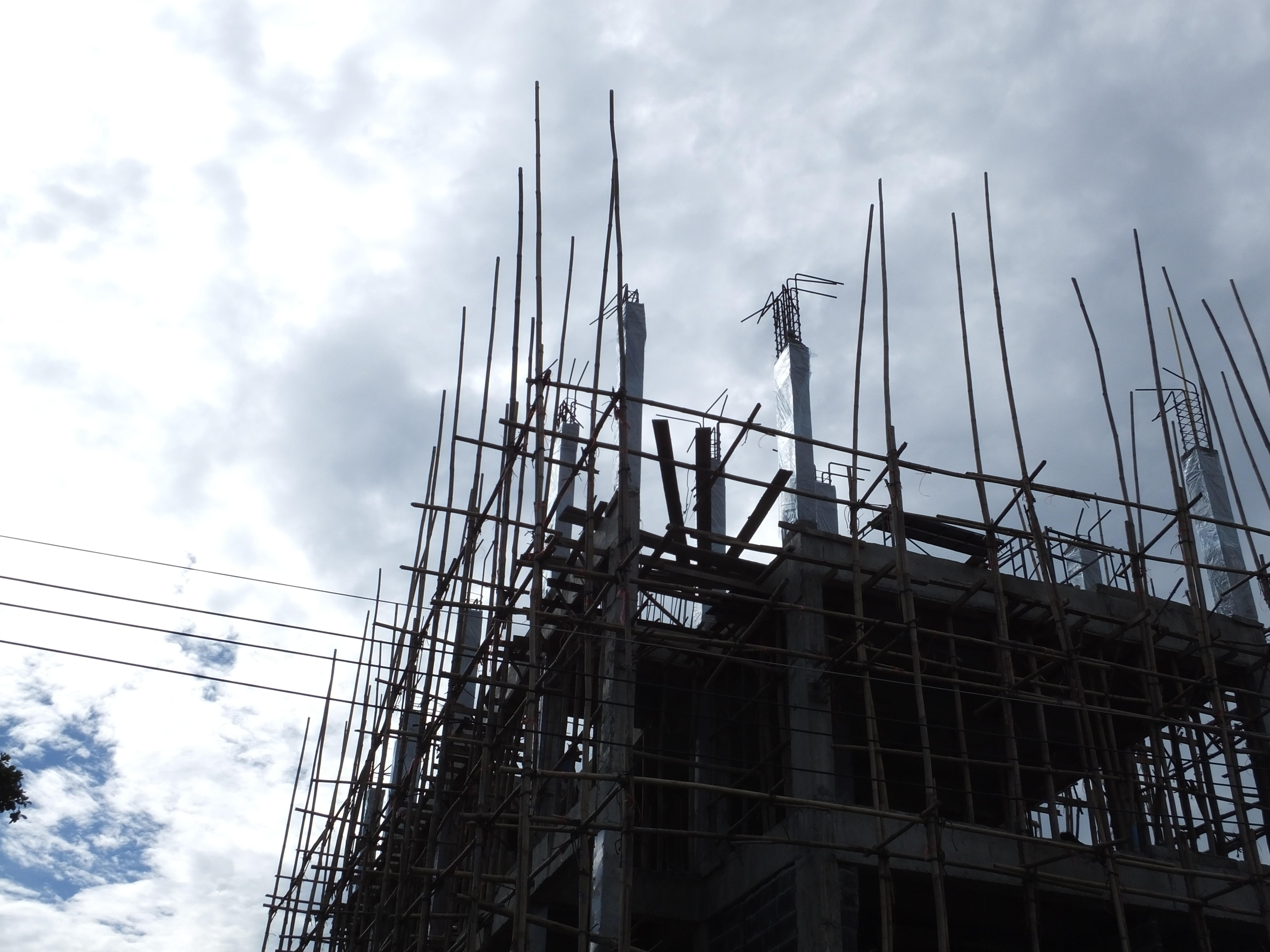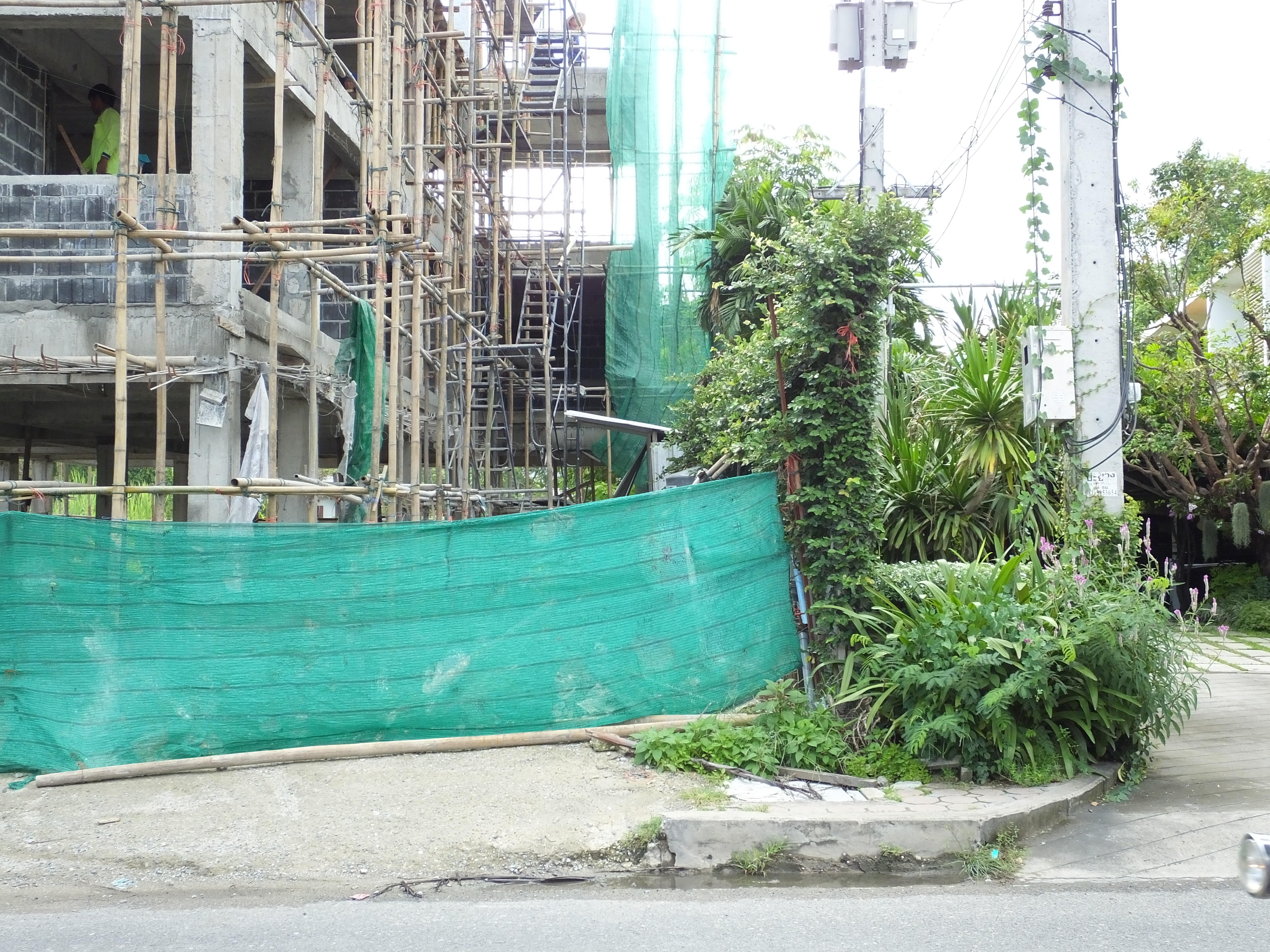 <中岡>この建築現場でもゼッタイ整理整頓した方が物事は早く進むのに、ともかくいるものいらないものすべてがポイ、という感じで置いてある。使わなくなった電線と新しい電線が両方束になっておいてあったりする。黒い電線がつながったまま束になっていて、それが町中に張り巡らされていていわば恐怖なんですが、建物の下の方には鉢植えとか家庭的なものがおいてあったりする。布などもそこらへんに張ってあるんですけれども、日本のように防音・防塵といった意味もっているものというよりは、なんでかわからないけれども垂れ下がっている。気持ちやってみたけど効果なかったね(笑)という感じで。一個一個のパーツにも彼らタイの日常の「ふるまい」が詰まっているなーと思って面白いとすごく思います。