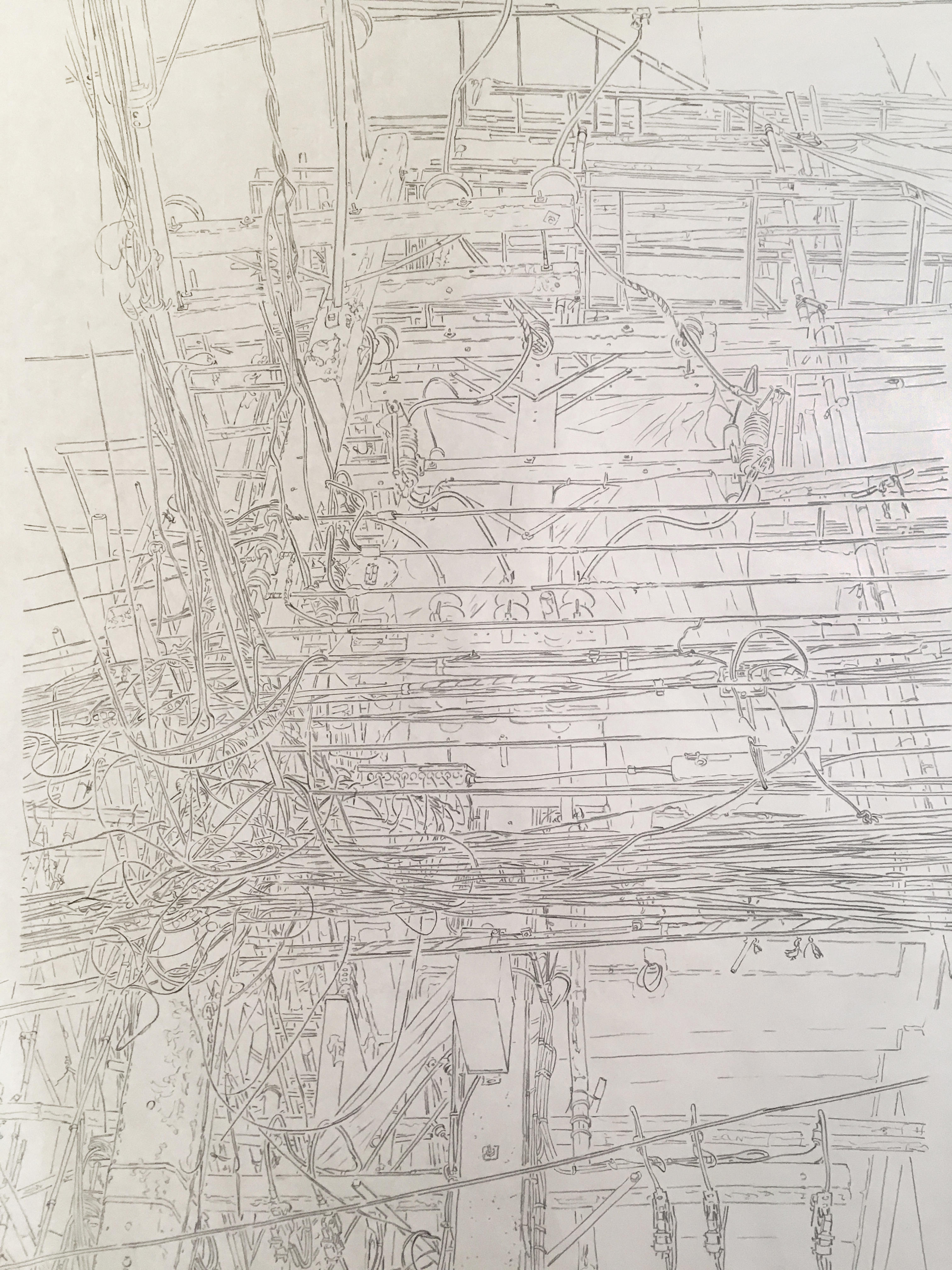 <AFG>この作品はベースに写真を複数とり、その写真をトレースしたとのことですが、この時点である程度のイメージの分解が始まっていますよね。写真をとるにしても同じ視点から上中下と撮ることで視線のずれを無理に合わせることで視覚上の亀裂ができていたりしていますね。