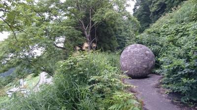 作品はオン・サイト(現場)とオフ・サイト(現場でない所)の展示に分かれています。オン・サイトは国道117を見下ろす、使われていない道に設置されています。使われてない道ですので普段は草が生い茂っていて昔のガードレールの跡を見ることも出来ます。作家は実際に使われなくなったアスファルトを掘り返した塊が大きな物体集まって象徴的に道を通せんぼしているような、どこまでもそれ自体で転がってゆきそうな物体を作っています。