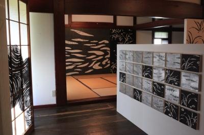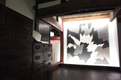 作品を展示しているその建物は、240年前に建てられた「ぶなの木学舎」という古民家。豪雪を耐え抜いた骨太な日本家屋に、作品はすっぽりはまり込んでいます。その姿を見るにつけ、作家が生涯をかけて追及してきた、「空間と日本画との関係性」というテーマが如何なく発揮されている空間になったと思われます。