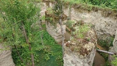 今は草の生い茂る土手に隠されるようにひっそりとある大きな土壁でつくられた回廊式の空間。その中庭には2011年の中越地震で崩れ落ちた屋根が取り払われたあと、自然の屋根となるようにと植えられたブナやトオカエデ、もみじ、だんごの木といった樹木が生い茂ります。そこかしこに草が生え、自然の生命力に浸食されながら人間の労働の痕跡が残されているとでもいえるような印象です。