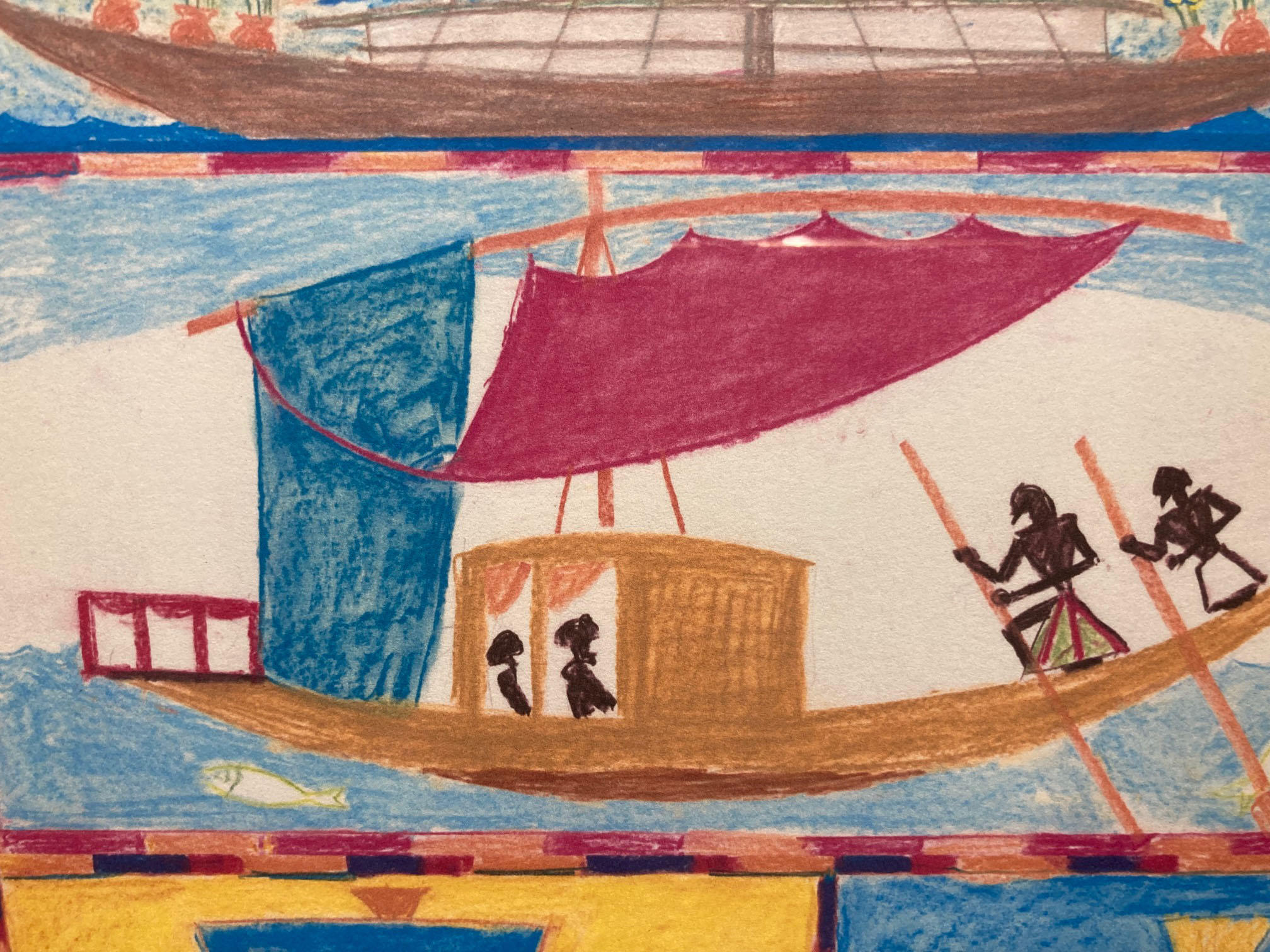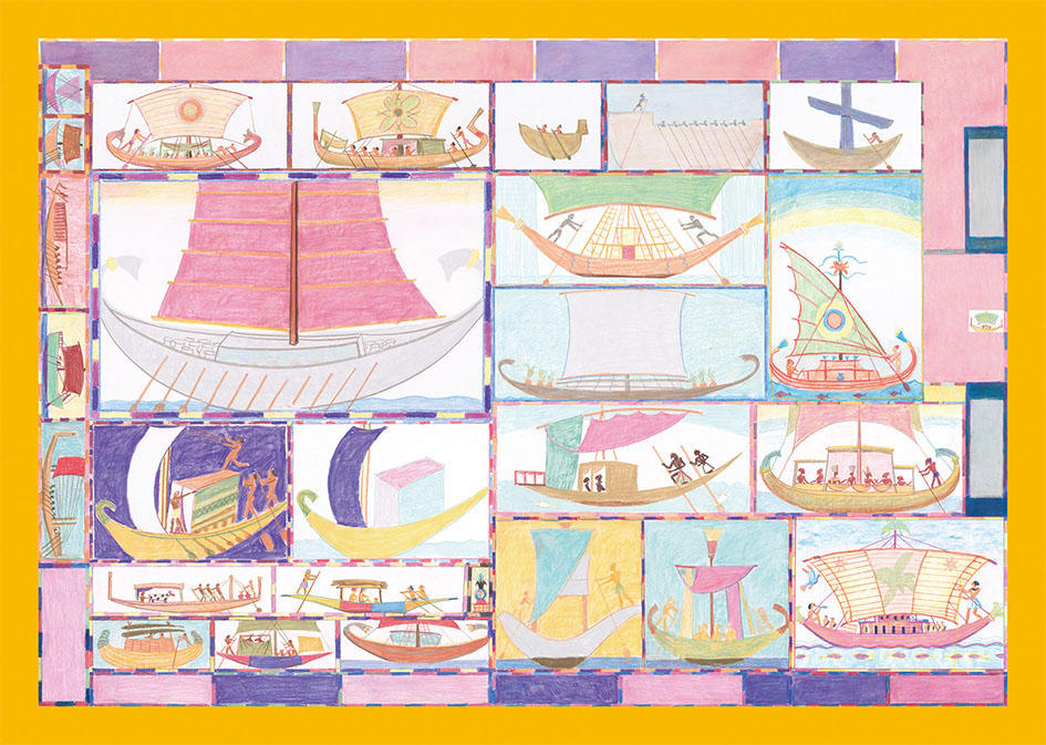 確かにエジプト人らしき船頭が、ちょっと風変わりな帆の舟を漕いでいるようすを作品の一部に見ることができ、こどもたちが描いているありのままを受け入れている、温かいカバコフの視線を感じることができる。