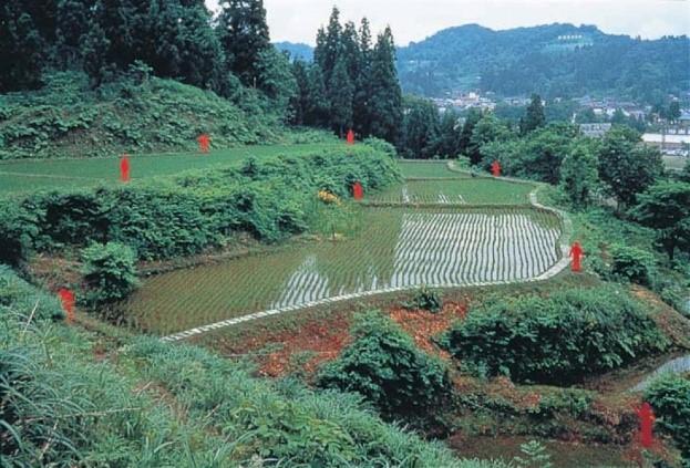 1994年のファーレ立川につづいてディレクター北川フラムに声をかけられ、最初のまったく何もない里山の風景にかかしを設置した。棚田の中に立ち並ぶ真っ赤なかかしは、棚田で働く人やその家族を型どった。