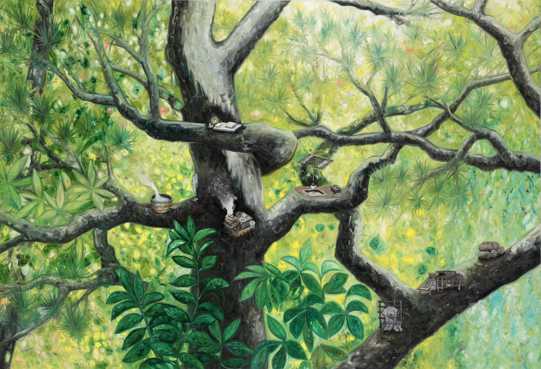妻有を舞台として描かれた作品。新潟の民族博物館など地元の調査を行ったときに、昔からの風習や建築空間を知り、囲炉ばたや米俵を木の枝の上に描いた。木は、一見ブラジルのジャングルを思わせるが、桜と松とモミジが左下に描かれている。2017年の北アルプス国際芸術祭にも出品された。