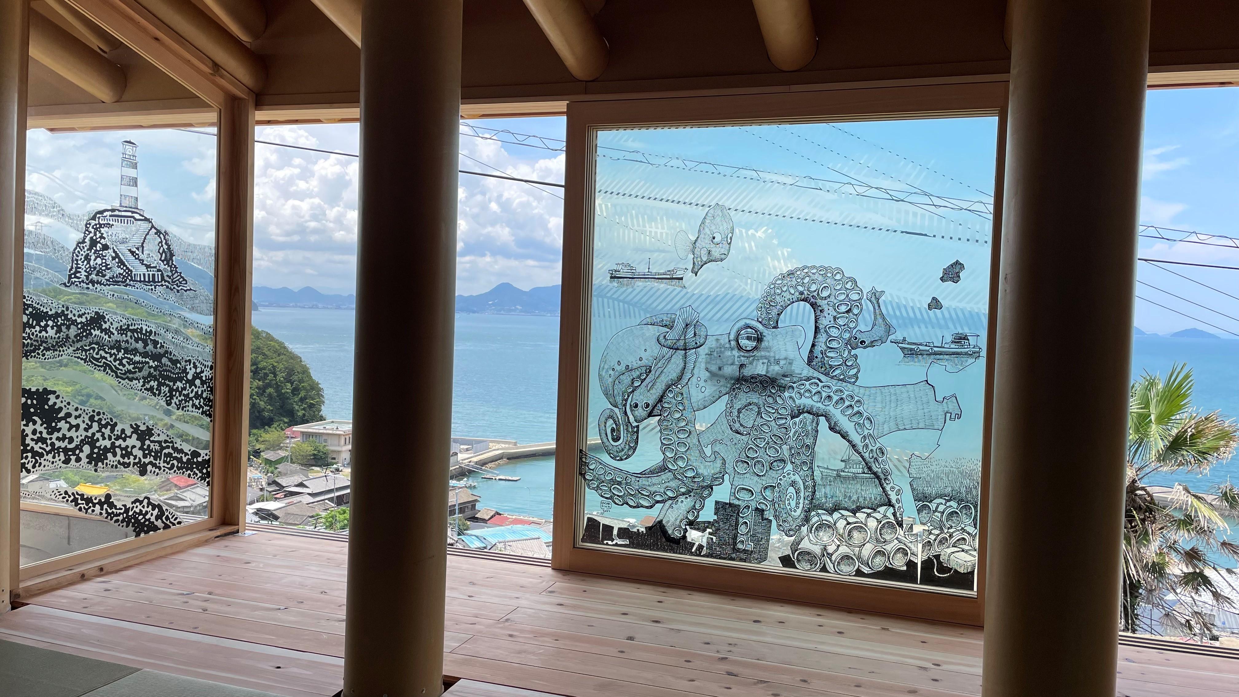 建築家・坂茂とのコラボレーションが実現した男木島パビリオンは、瀬戸内国際芸術祭の眼玉の1つだ。被災地を含め世界中どこでも紙管で構造をつくる坂のつくった建物の窓いっぱいにオスカールが海の生物を描いた。窓をスライドさせると図柄が重なり合い、その向こうには瀬戸内の島々が拡がっている。