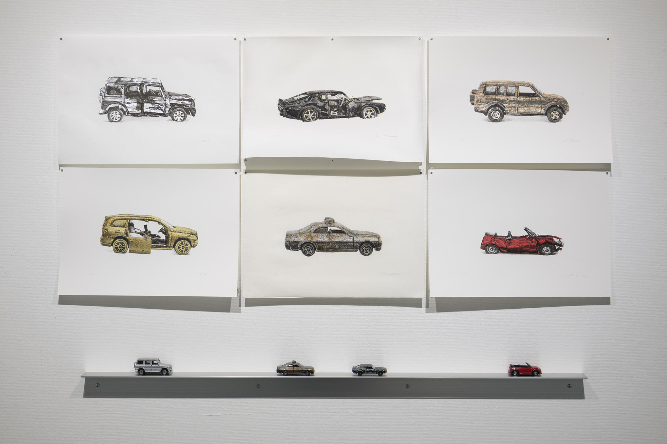ミニカーシリーズ(リトグラフ)の展示風景 各図柄はedition 10、ミニカーは各図柄につき1点のみ