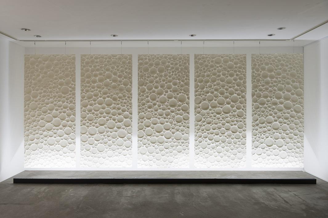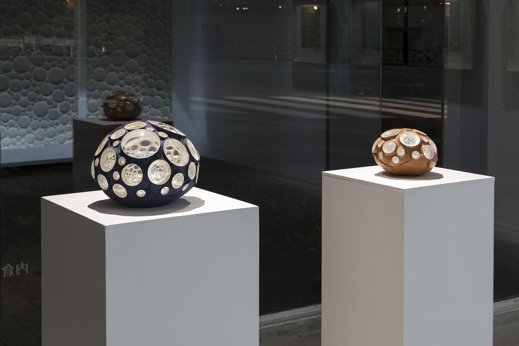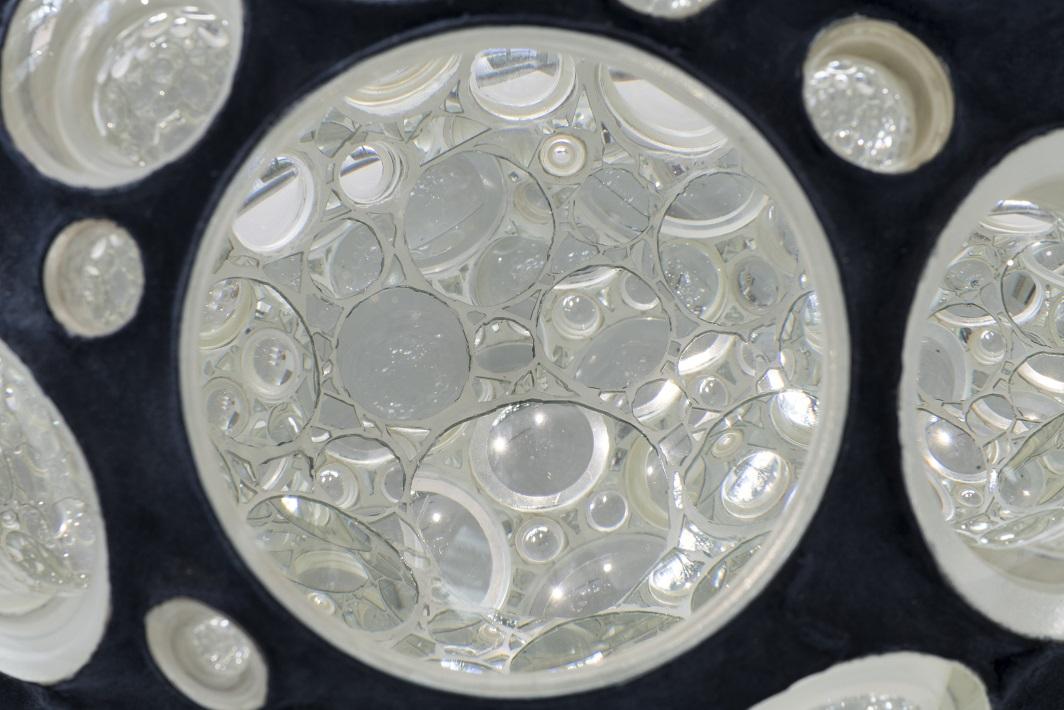 40代の頃に心臓を患うことがあって、大変めずらしい病気だったので田舎の医者には知識不足だったようです。苦しかった私は、東京の医者の友達に相談してみて検査したところ、入院して即手術となりました。集中治療室で隣に寝ていた人たちが次から次へと亡くなり、入れ替わる様を目の当りにしながら、同じく死の瀬戸際に居た私。命の終わりはとてもシンプルな事だと知りました。襖を静かに開けて向こうの部屋に行くだけ、そういう感じなんだなと思いました。美術をやる醍醐味は「生き」「死に」に関わること、生きている意味について関わってこそと学生の頃から思っていましたが、周辺を彷徨くばかりで踏み込むことはできず、この時にはじめて解かりました。そしてこの形が生まれました。生きているとはこういうことだと思いました。レンズの1つ1つが触覚みたいなもので細胞の間を空気が流れるような、そういう形になっています。