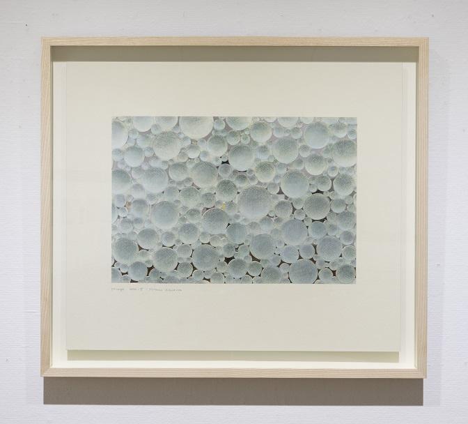 12年前から取組んで来たものです。リュミエールを作っていた時にたまたま紙の向こう側にプラスティックの板があり、それが反射して鏡のように見えたんです。また家の前に森があって樹々が風に揺れるとその間から空がチカチカみえるんです。それらのイメージを作品化しました。アクリルミラーにどうやって仕込むか、接着はどうするかとか。若い時と違い、接着剤の怖さを身に沁みているし… 大変技術の高いパリの印刷屋さんへ通って試作してみましたが、できたものは工業的でファインアートのふくよかな感じがなかったんですね。それも頓挫。手が届きそうなのに掴めそうで掴めないミラージュ。ミラージュという名前が悪かったかと。今回の展覧会ではどうしても皆さんに見て欲しくて力ずくで形にしました。じっと見ていると、自分の姿がうっすらと映ってきます。