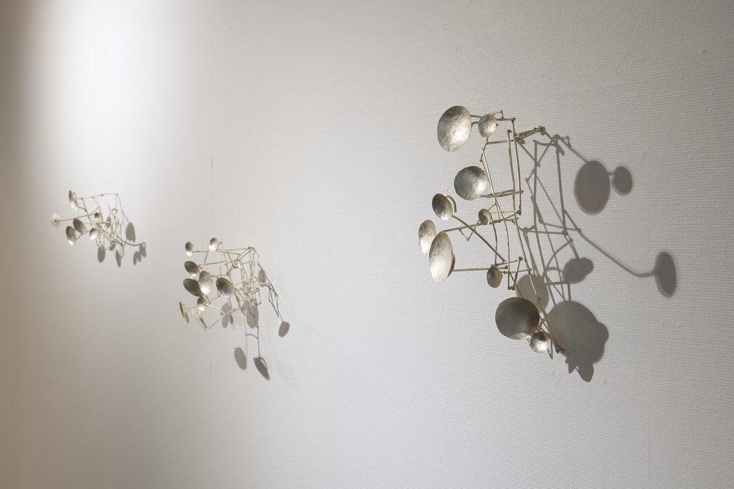 銅を鍛造し構成して、銀メッキ後にラッカーでコーティングを施しています。元はと言えば、貴社のTさんに内倉さん金属やらないの?と言われ、紙の私にいきなりそんなことを言われてもと思ったのですが、何回か試行錯誤を繰り返しているうちに材料が自分のものになっていくというか、この材料と仲良くする自信が生まれました。夏の明け方近くにクモの巣がいっぱい張られている。少し明るくなった頃キラリと光る夜露、その美しさに我を忘れて私達は惹かれます。そういう我を忘れる体験はとても大事です。私達の日常はいろんなことに縛られて煩わされています。実は、忘我の瞬間こそ我の魂に出会っている時だと思うんです。最初は私の作品をみて綺麗すぎるとかインテリアじゃないの?美し過ぎるものは美術作品ではない等と言われたこともありますが、私としては常に美しいものをつくりたいと思っています。
