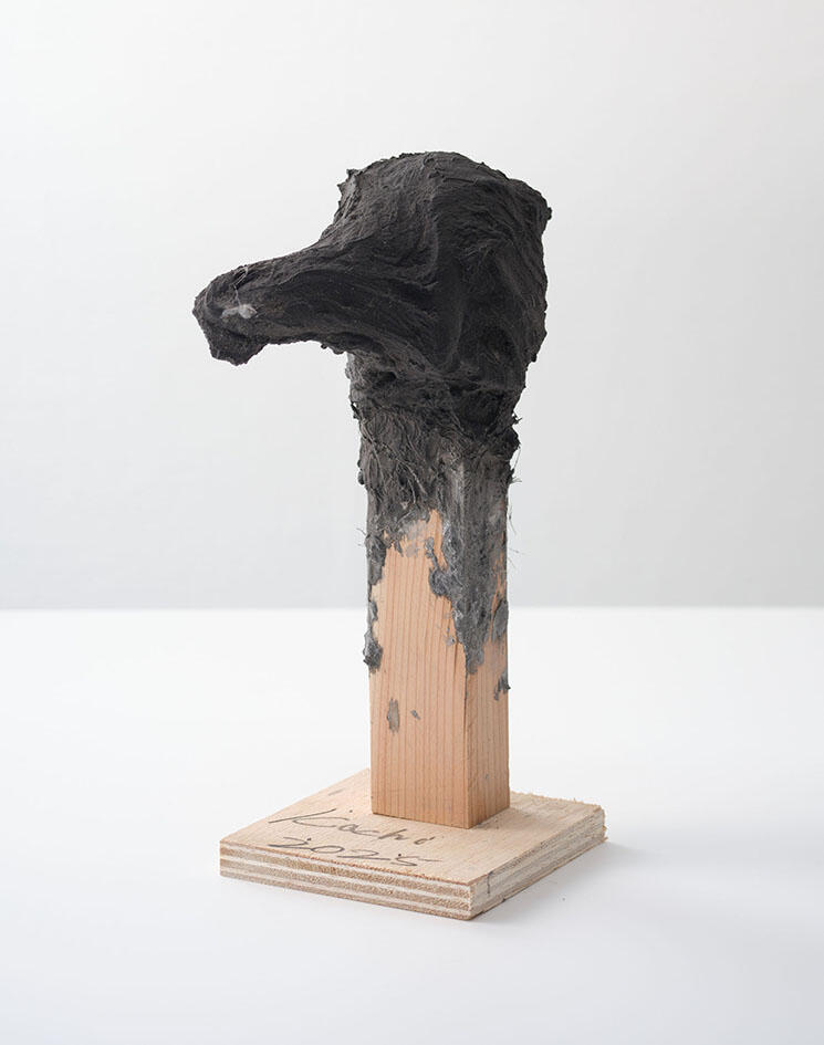 今回の連続個展では、去年2024年暮れに韓国広州市に滞在し、制作した一連の人物や家具などをモチーフとする作品が第一期「Study of Dansaekhwa」(2025年3月5日-3月16日)の中心を占めていたのに対して、第二期「Dansaekhwa」(同年3月21日-4月20日)では帰国後の最新作が大作を含め数多くの紹介されている。韓国現代美術の一潮流である「Dansaekhwa(単色画)」に現地で触れたことで、そのモノクロームとマチエールの独自性に関心を持ち、こころ惹かれたことで、それまでの過剰ともいえるほどの奔放な色感に溢れた作品がかなり抑えられ、いままでの自分の制作を「エポケー(括弧入れ)」する態度が前面に現れはじめていた。もちろん、それでも、あのレリーフ状の半立体作品ともいえるほどの大量の絵具の厚みは、基本、変わることはなく、単純に壁に掛けられた絵という風にだけではとらえ切れないものであり、実際、墨色の絵具と石膏を木製の心棒付きの台座に塗って盛った完全に立体の《Kkachi까치》と題された作品もいくつか生まれている。日本語では「かささぎ」。塊としての絵具をひとつの原型として提示する作品であり、動物表現独特の自然な寛ぎを感じさせるけれども、「単色画」に呼応する、必要にして十分な試行を重ねる創作姿勢が、ほのかに、だが確実に、高さ25.5cmという、この作家としてはささやかな規模であっても窺えるのだ。