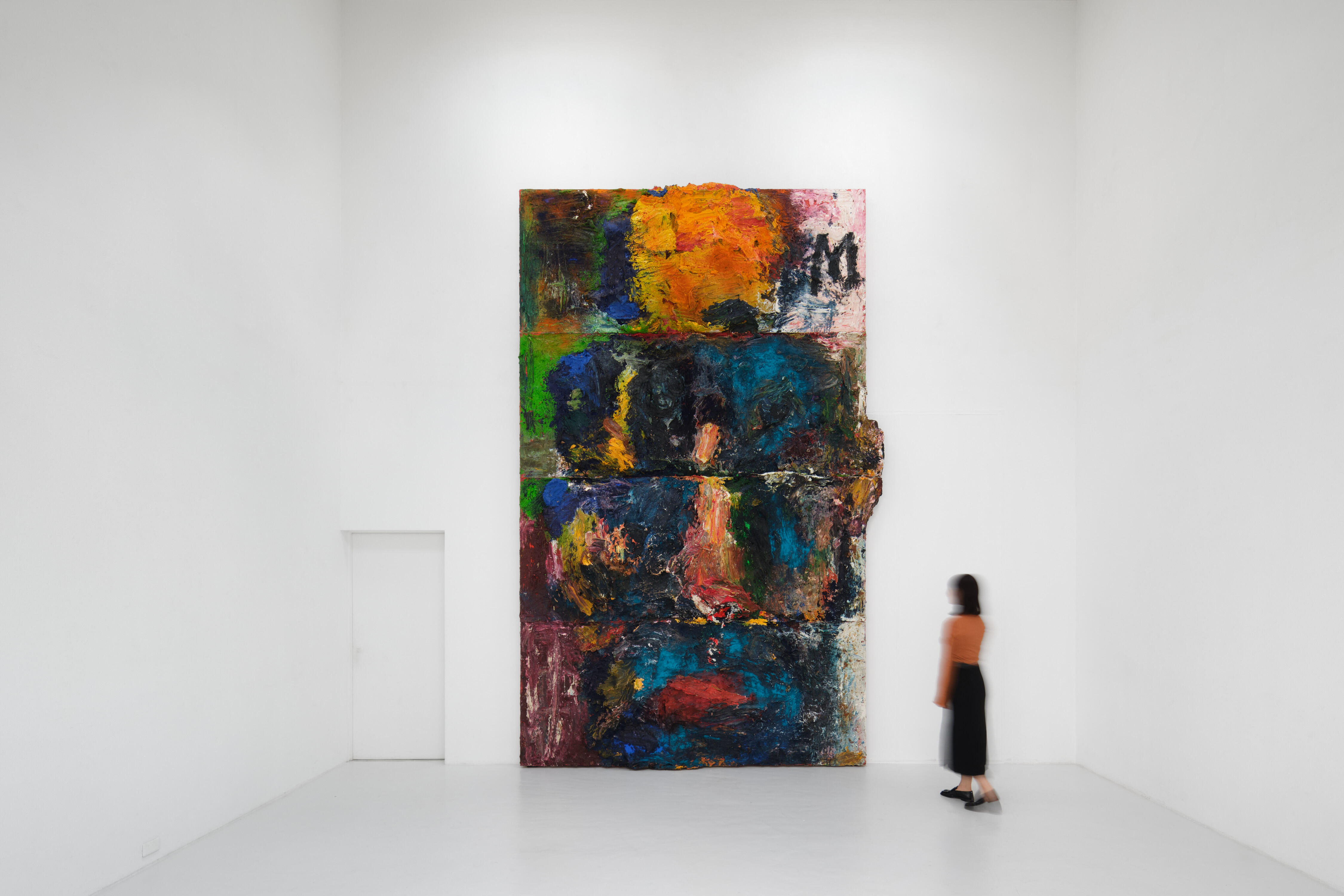 東京藝術大学の大学院修士課程での卒業制作は、大学の展示空間での発表はままならず、結局、展示中止となってしまった。垂直に5枚のパネルを重ねていくと縦720cmに達するという桁違いの大作であり、厖大な量の絵具が使用されているので総重量もおそらく1tぐらいといってもおかしくないと感じられる作品である。実際、Gallery 21 yo-jでの個展「転ぶ人」(2024年4月25日 - 5月12日)で、メイン・スペースにその1点だけが展示公開されたときも、最下部のパネル1枚は天井高の限界のために足すことはできず、不完全な状態で、まさに「転ぶ人」として展示されたのだ。